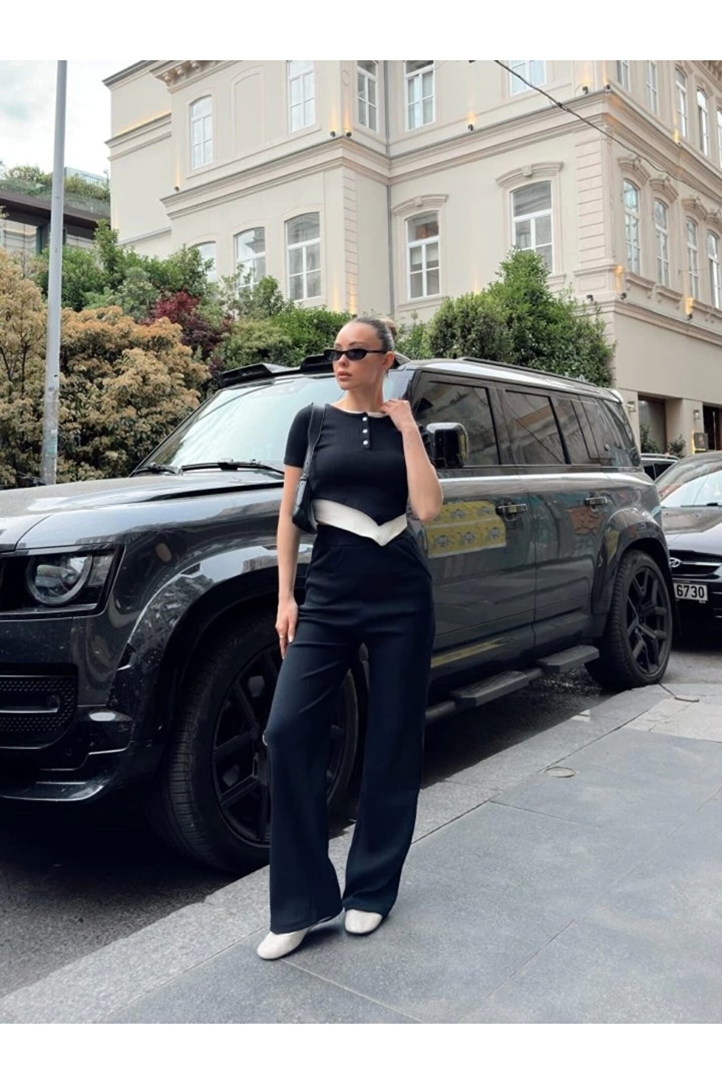 Modayakamoz Kadın Bisiklet Yaka Asimetrik Kesim Atlet Detay Bluz Ve Yüksek Bel Bol Paça Pantolon Ikili Takım
