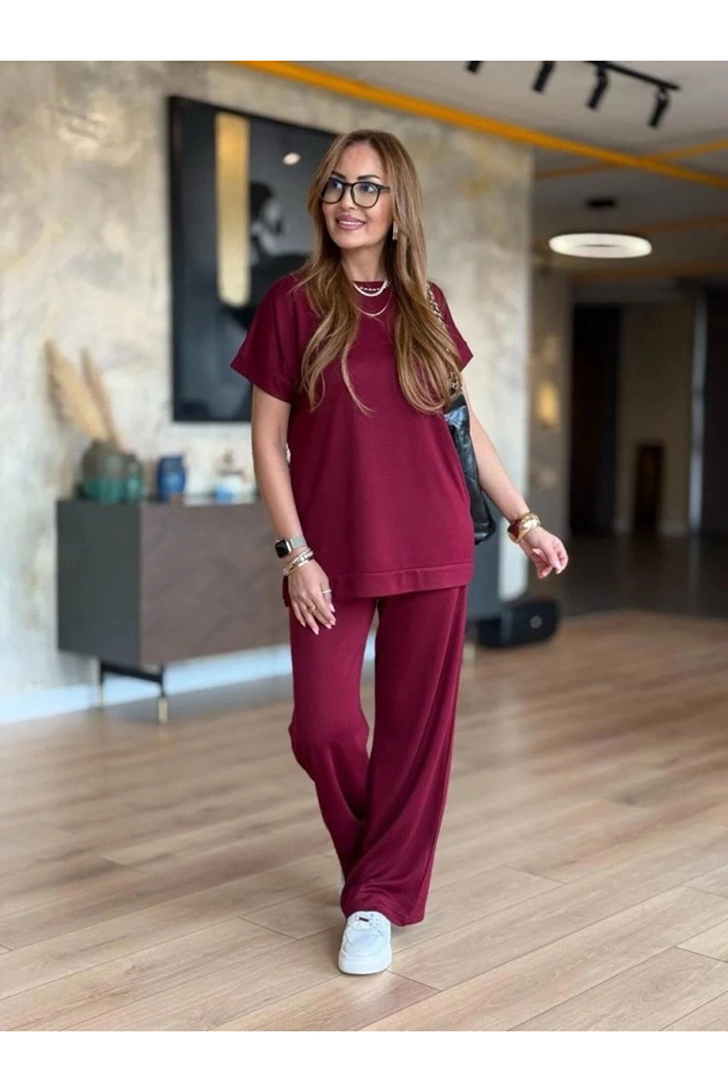 Kadın Kısa Kollu Bisiklet Yaka Viskon Iki Iplik Bluz Ve Pantolon Ikili Takım