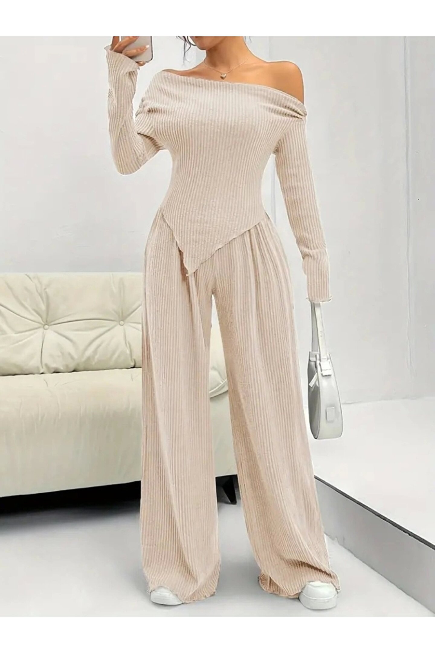 Modayakamoz Kadın Uzun Kollu Omuzlardan Açık Asimetrik Kesim Kaşkorse Bluz Ve Pantolon Ikili Pantolon