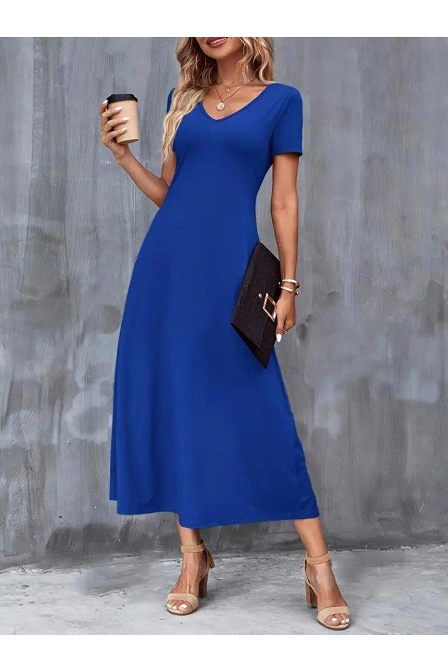 Kadın Kısa Kollu V Yakalı Cepli Kısa Viskon Elbise
