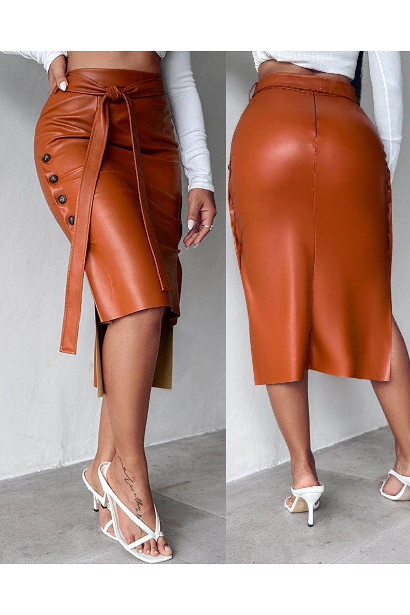 Kadın Yüksek Bel Kuşaklı Yanlardan Düğmeli Mini Deri Etek