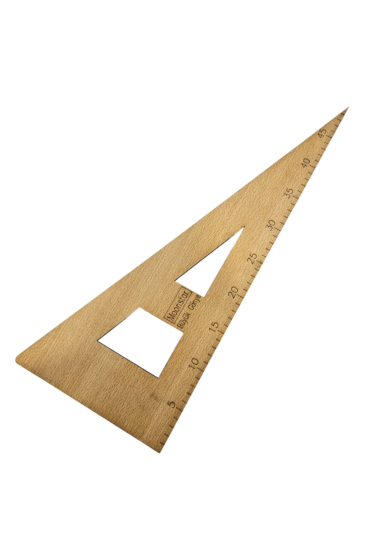 Ürün Adı: Ahşap Büyük Gönye Riga Cetvel Hammadde: Ahşap Marka: Moonstar Menşei: Türkiye Açıklama: Numaralı büyük gönye, ölçü alma, dikiş payı verme, kalıba açı verme, dik açı oluşturma ve düz çizgi oluşturmada kullanılır.