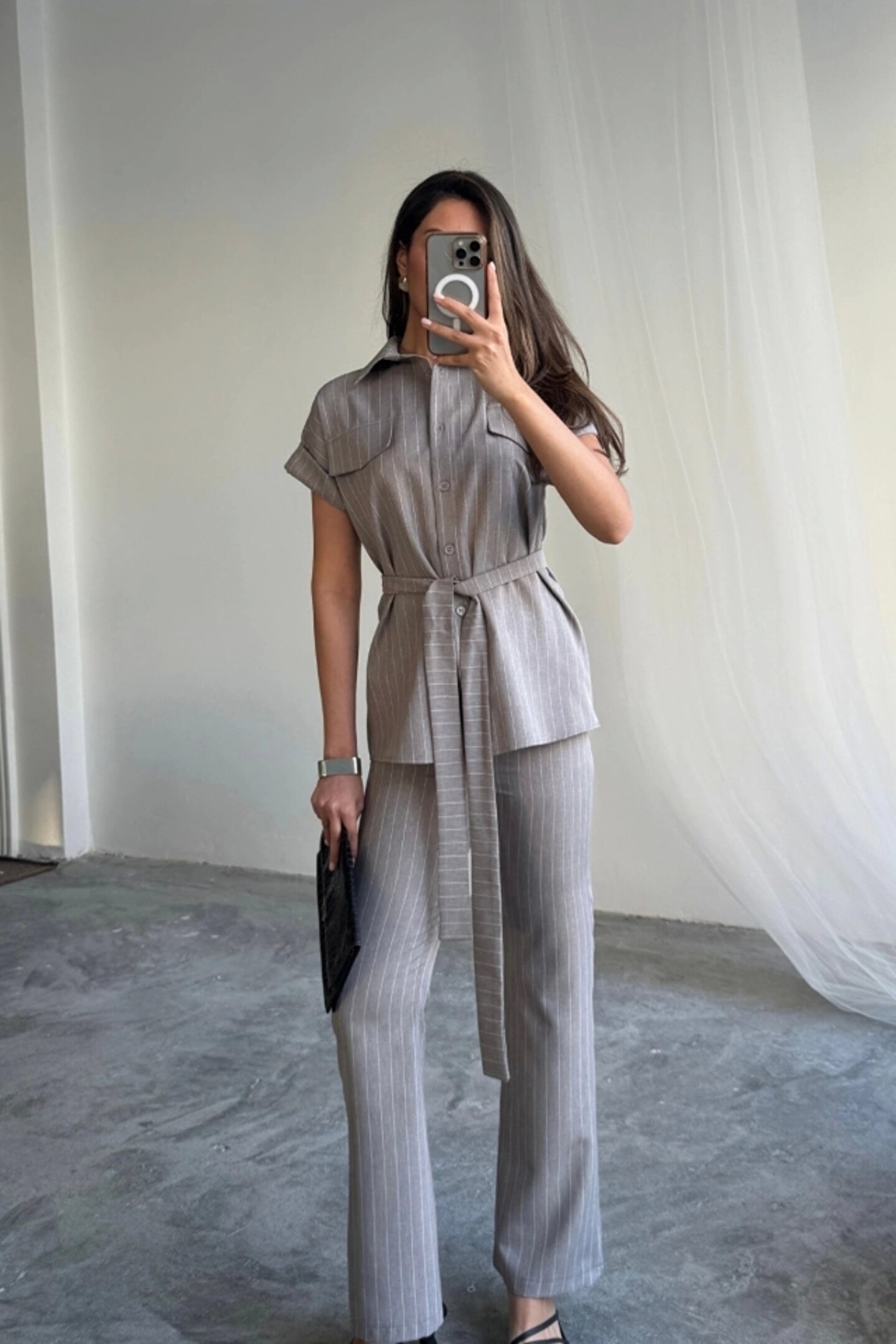 ÇİZGİLİ POLYVİSKON BLUZ - PANTOLON TAKIM - Gri