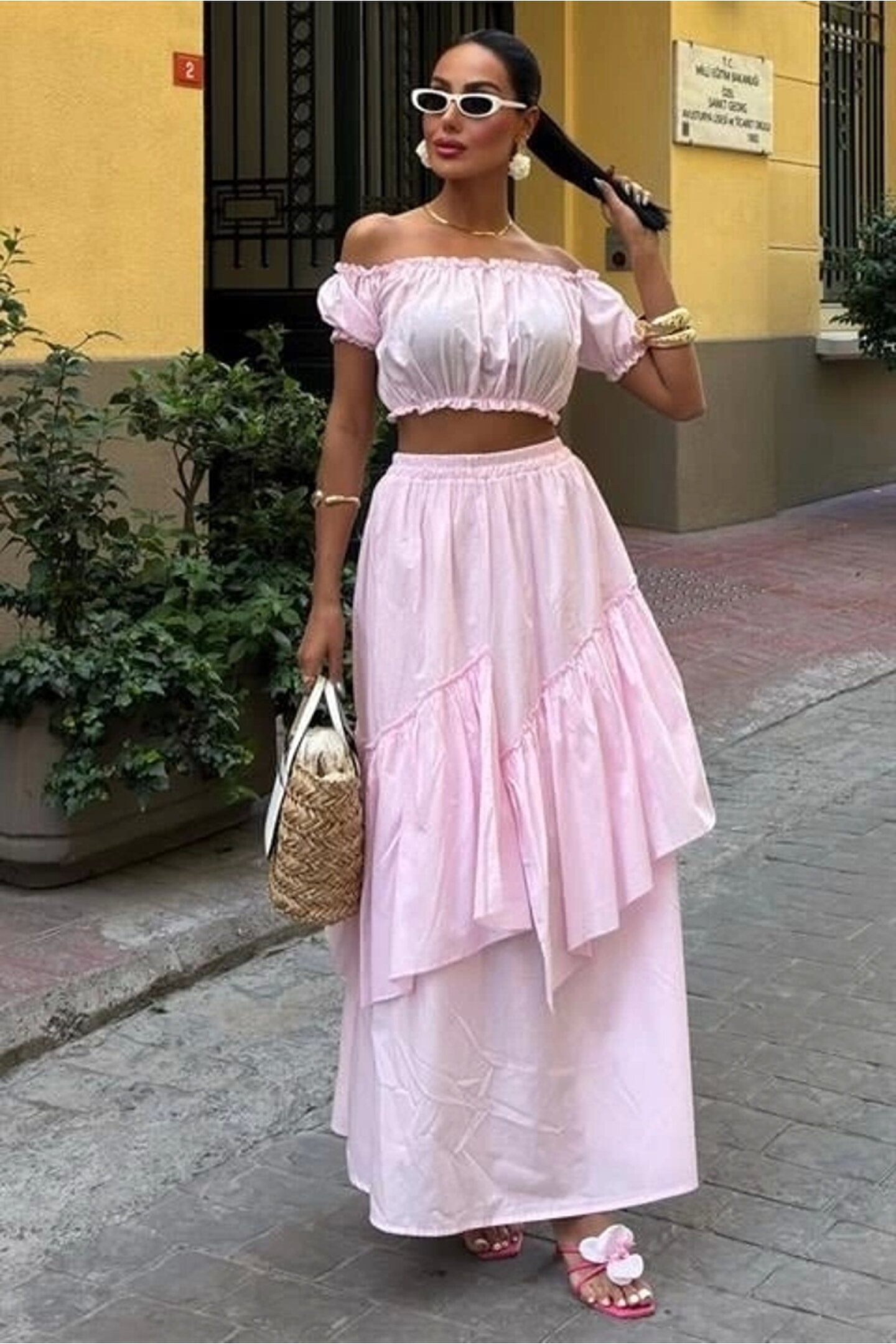 mrpurple Büzgülü Crop Kat Detaylı Fırfır Etekli Takım 10196