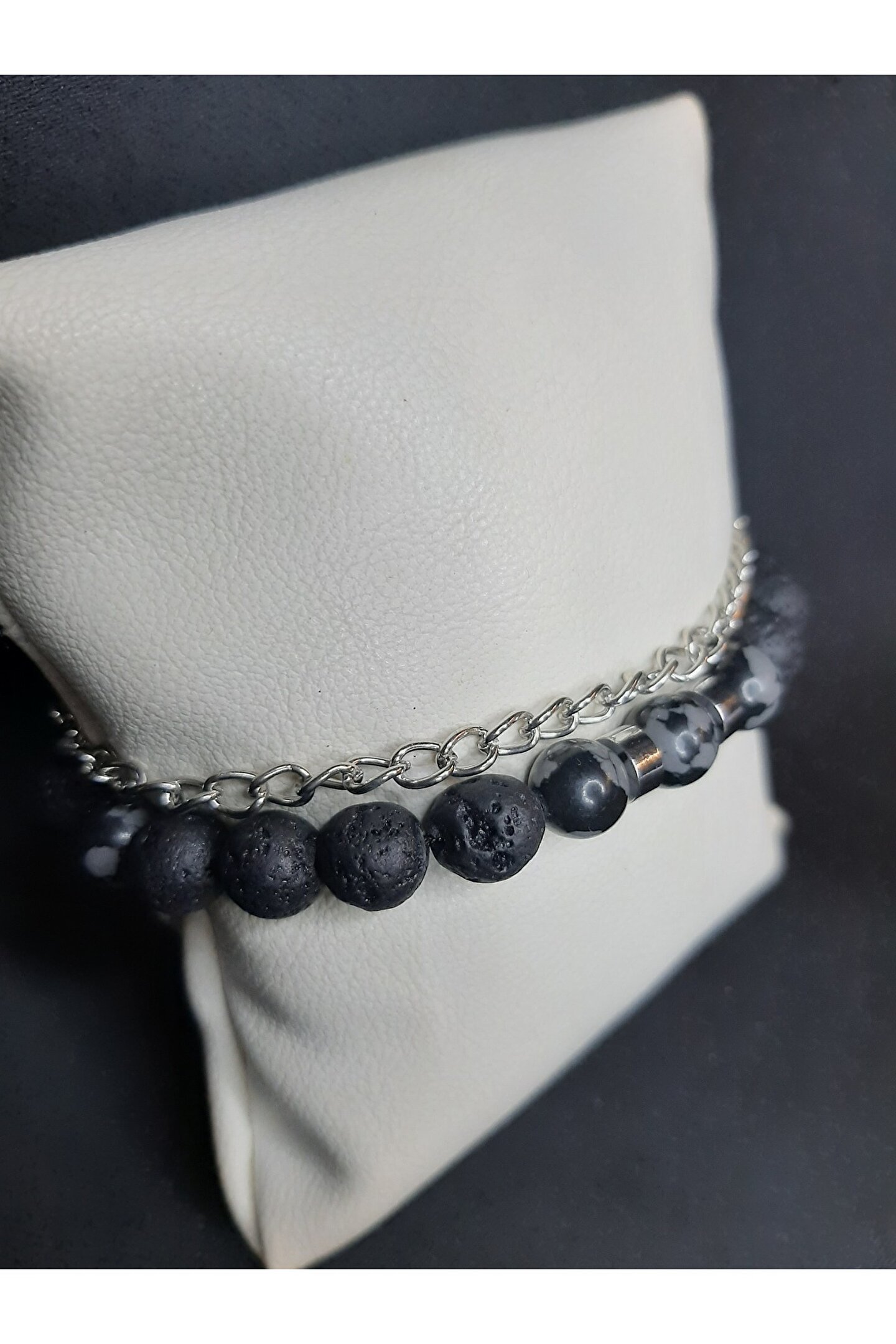 - Doğal taş kullanımı sayesinde her bileklik benzersiz ve otantik bir görünüm sunar.; - Siyah lav taşı ve füme akik taş detayları ile şıklığı ve zarafeti bileğinizde taşıyın.; - Ayarlanabilir zincir tasarımı, farklı bilek ölçülerine kolayca uyum sağlar ve konforlu bir kullanım sunar.; - Gıda ile temas için uygun değildir; bu nedenle hijyenik bir kullanım için dikkatli olunmalıdır.; - Türkiye'de üretilmiş olup, yerel işçilik ve kalite standartlarına sahiptir.; - Hem erkekler hem de kadınlar için uygun unisex tasarımıyla geniş bir kullanıcı kitlesine hitap eder.; - Yetişkinler için tasarlanmış olup, her yaştan insanın bileğine uygunluk gösterir.;
