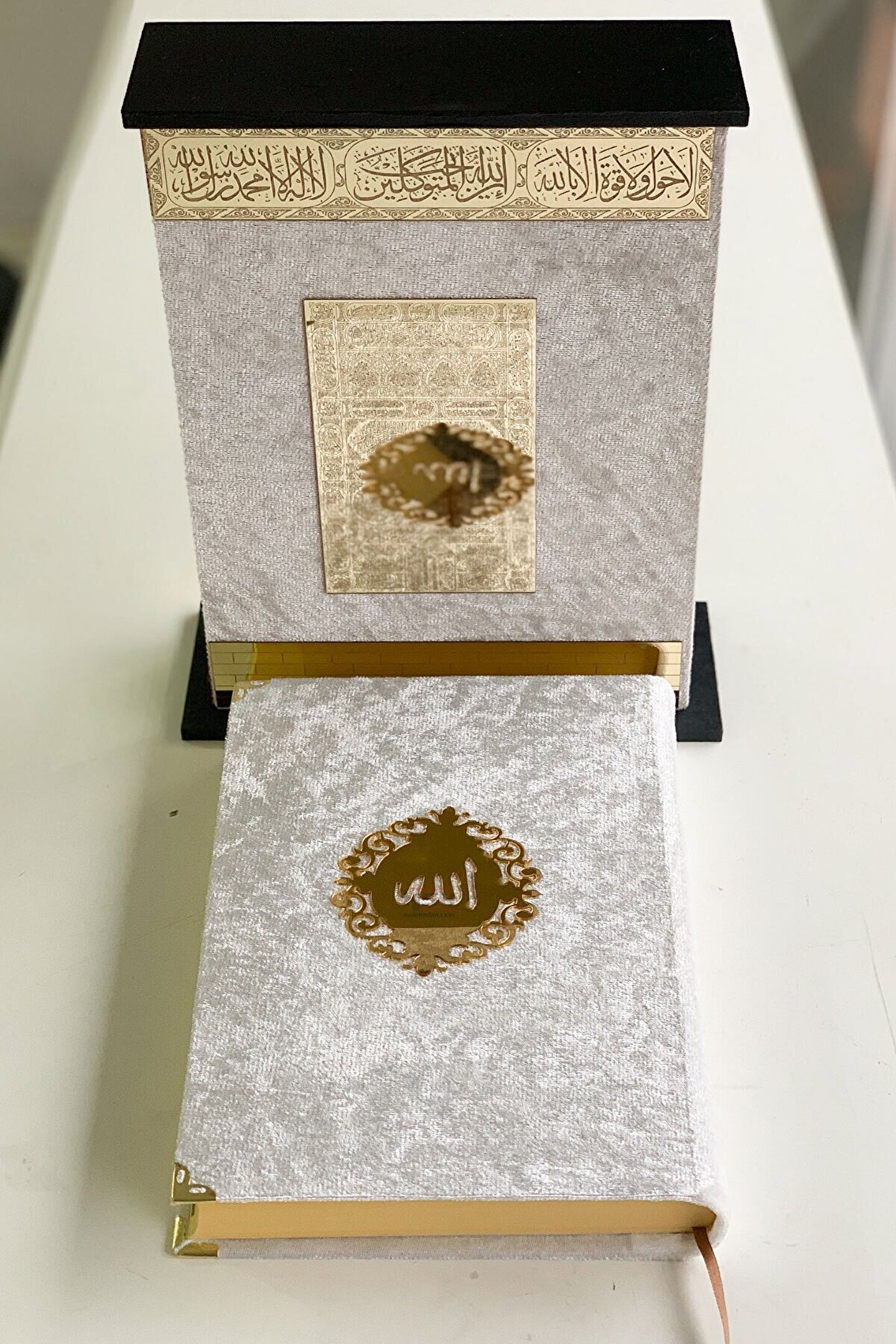 Siyah Kadife Kaplı Kabe Muhafazalı Kuranı Kerim, dışındaki kabe desenli pleksileriyle manevi bir hediye vermek isteyenler için çok güzel bir tercih olacaktır