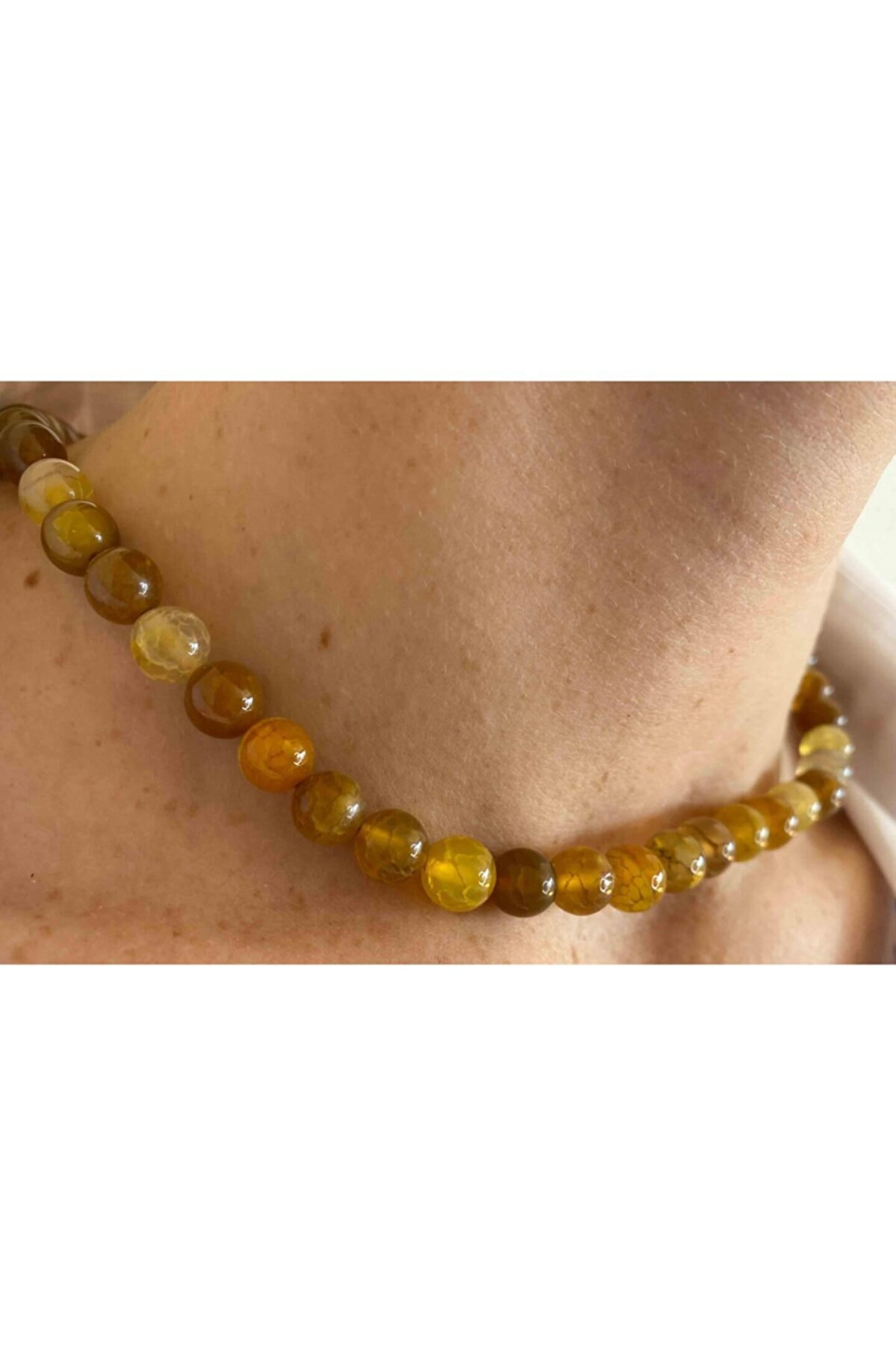 Doğal akik taşı kullanılarak üretilmiş, her bir kolye parçasında benzersiz desenler ve renk tonları bulunur; 8 mm boyutundaki bu kolyeler, zarif ve şık bir görünüm sunar; Doğal taş materyali sayesinde, her kolye el yapımı gibi hissettirir ve doğallığıyla dikkat çeker; Akik taşı, enerjiyi dengelemeye yardımcı olur ve duygusal dengeyi destekler;