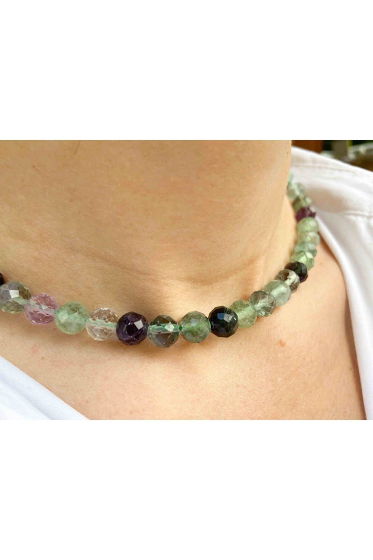 Doğal Florit taşı kullanılarak üretilmiş, her bir kolye parçasında benzersiz desenler ve renk tonları bulunur; 8 mm boyutundaki faset kesim, ışığı mükemmel bir şekilde yansıtarak göz alıcı bir parlaklık sağlar; Doğal taş materyali ile hem şıklığı hem de doğallığı bir arada sunar; her kıyafetle uyum sağlayacak zarif bir aksesuar seçeneği oluşturur;