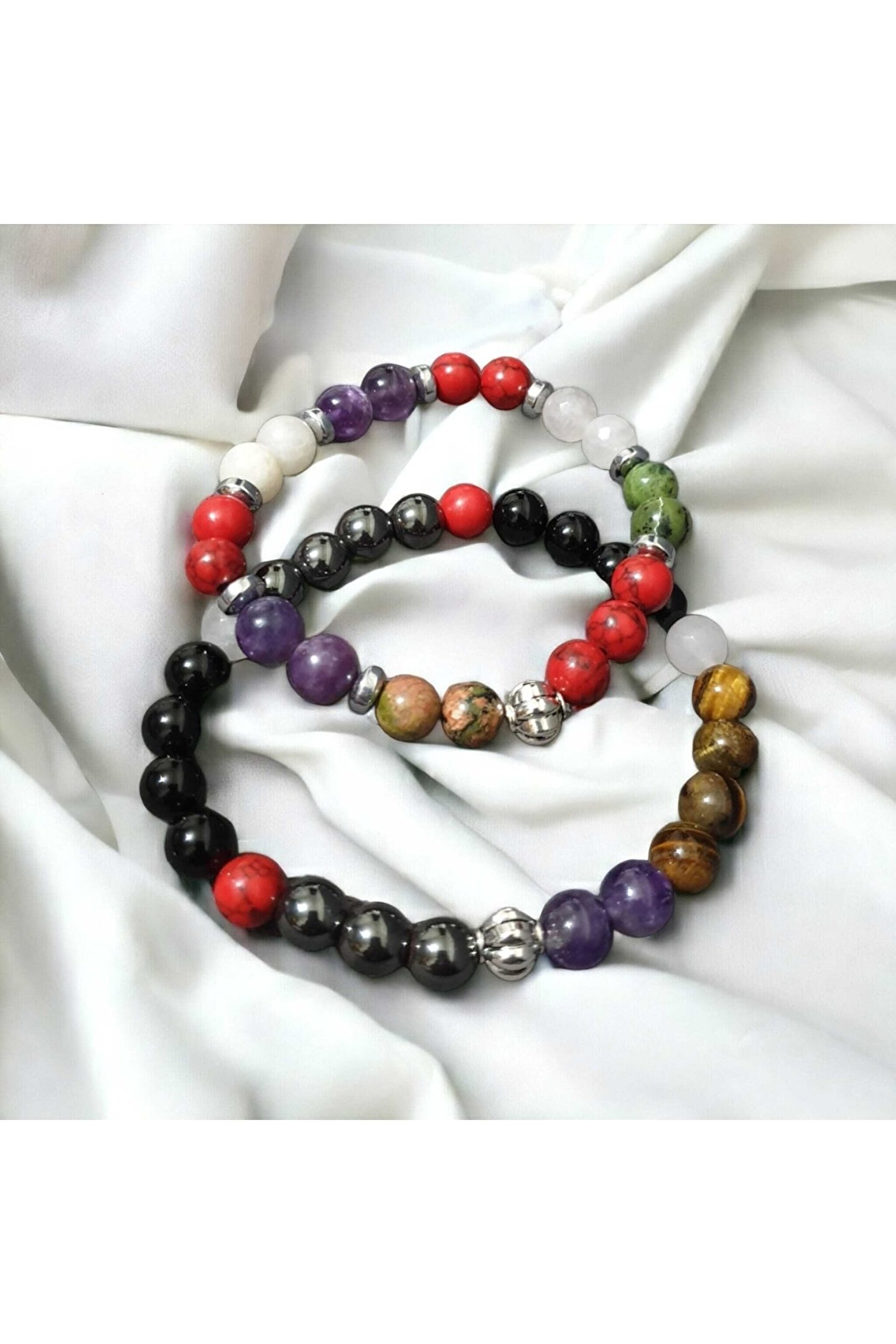 Vazgeçilmezlik Bilekliği (2'li Set Bay-Bayan) Doğaltaş İşlenmemiş , toprağın altında olduğu haliyle kalmış taşlara doğal taş denir. ; İşlenmemiş taşlar kendi titreşim ve frekanslarını yayarlar. ; Bu sayede olumlu şekilde çeşitli bedensel faydalar oluştururlar. ; Doğal taşlar enerjilerini kaybetmezler. ; Çok eski zamanlardan günümüze kadar birçok medeniyet taşların enerjilerini şifa ve huzur kaynağı olarak inanış haline getirmişler ve üzerlerinde kolye bileklik küpe gibi aksesuarlarla taşımışlardır. ; Ametist, Havlit, Kaplangözü , Pembe Kuvars, Depidolit, Yeşim, Ay Taşı ve Unakit Taşlarından oluşur.;