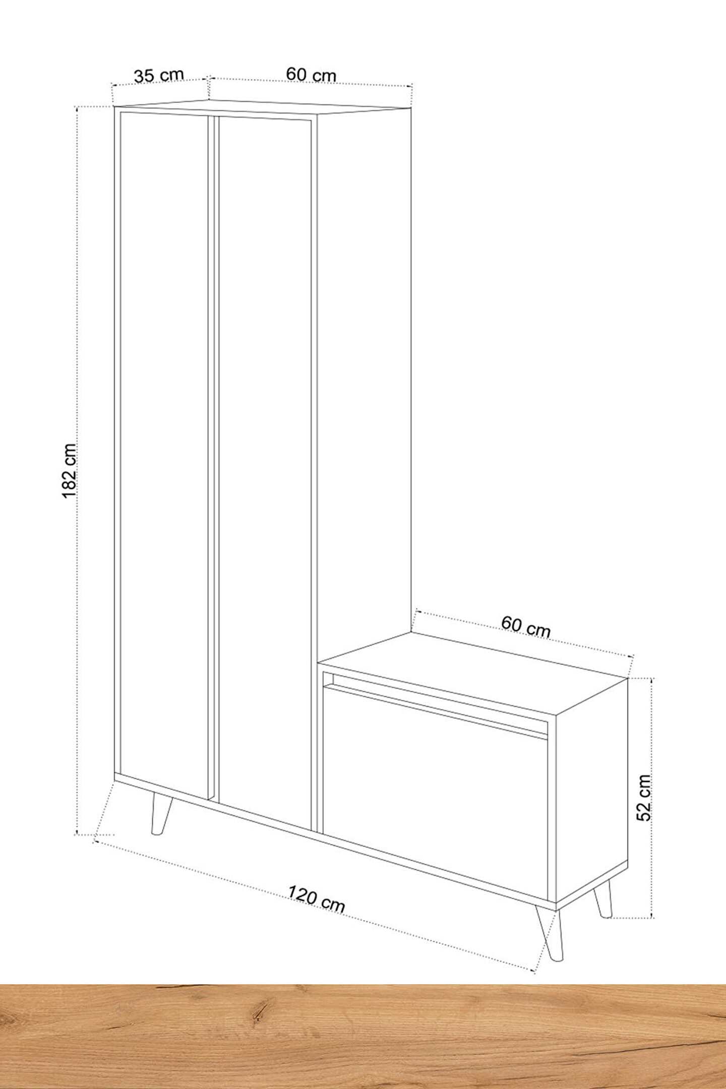Ürün Ölçüleri;G120 cm D35 cm Y182 cm;G:Genişlik D:Derinlik Y:Yükseklik;Malzemeler;GÖVDE: ALTIN MEŞE SUNTALAM;KAPAK: BEYAZ SUNTALAM;AYAK: 12 CM PLASTİK BEYAZ AYAK;Renk;BEYAZ-MEŞE;Ürün Özellikleri;*Kullanılan Tüm Malzemeler TSE onaylı, E1 Kalitesinde olup Kanserojen madde içermez ve Anti Bakteriyeldir.;*Görseldeki ayna ve tüm diğer aksesuarlar dekorasyon amaçlıdır. Ürüne dahil değildir.; *Montajı kolaylaştıracak biçimde kurulum talimatı yer almaktadır. Minimal ölçüleri ile dar alanlarda çözüm ortağı olabilir. Kapalı saklama alanları ile depolama ihtiyacınızı karşılayacak niteliktedir. Şık bir ayna ile kombinlendiğinde, tüm mekanlarda dekorasyon ögesi olarak yer alabilir.;Montaj;Ürünlerimiz özel kargo paketinde demonte olarak teslim edilir.;Paketlerde gerekli kurulum şeması, tüm vida ve aksesuarların montaj seması ile uyumlu malzeme torbası ve kullanma kılavuzu çıkmaktadır.;Kurulum müşteriye aittir.;Hızlı ve hatasız kurulum için montaj şeması bulunmaktadır.;Ürün kurulumunda profesyonel yardım alınmalıdır.;Montaj İçin Gerekli Aletler;*Şarjlı Tornavida;*Çekiç;Değişim ve İade Koşulları;Ürünü kargodan teslim alınırken paketler mutlaka kontrol edilmeli, hasarlı paket veya ürünler teslim alınmamalı ve kargo yetkilisine hasar tespit tutanağı hazırlanması doğrultusunda yardım talep etmeniz gerekmektedir.;Çevreye ve sağlığa zararsız kanserojen madde içermeyen E1 kalite standardında malzeme kullanılmıştır.;Aksesuarlar;* Montaj: Ürün kurulu olmadan (demonte olarak) kutulu halde teslim edilmektedir.; * Kutu içinde tüm kurulum için gerekli olan malzeme çıkmaktadır (Bazı ürünlerin kurulumu için ek olarak tornavida, çekiç gerekebilir);* Ürün resimlerindeki aksesuarlar teşhir amaçlı olup, fiyata dahil değildir.