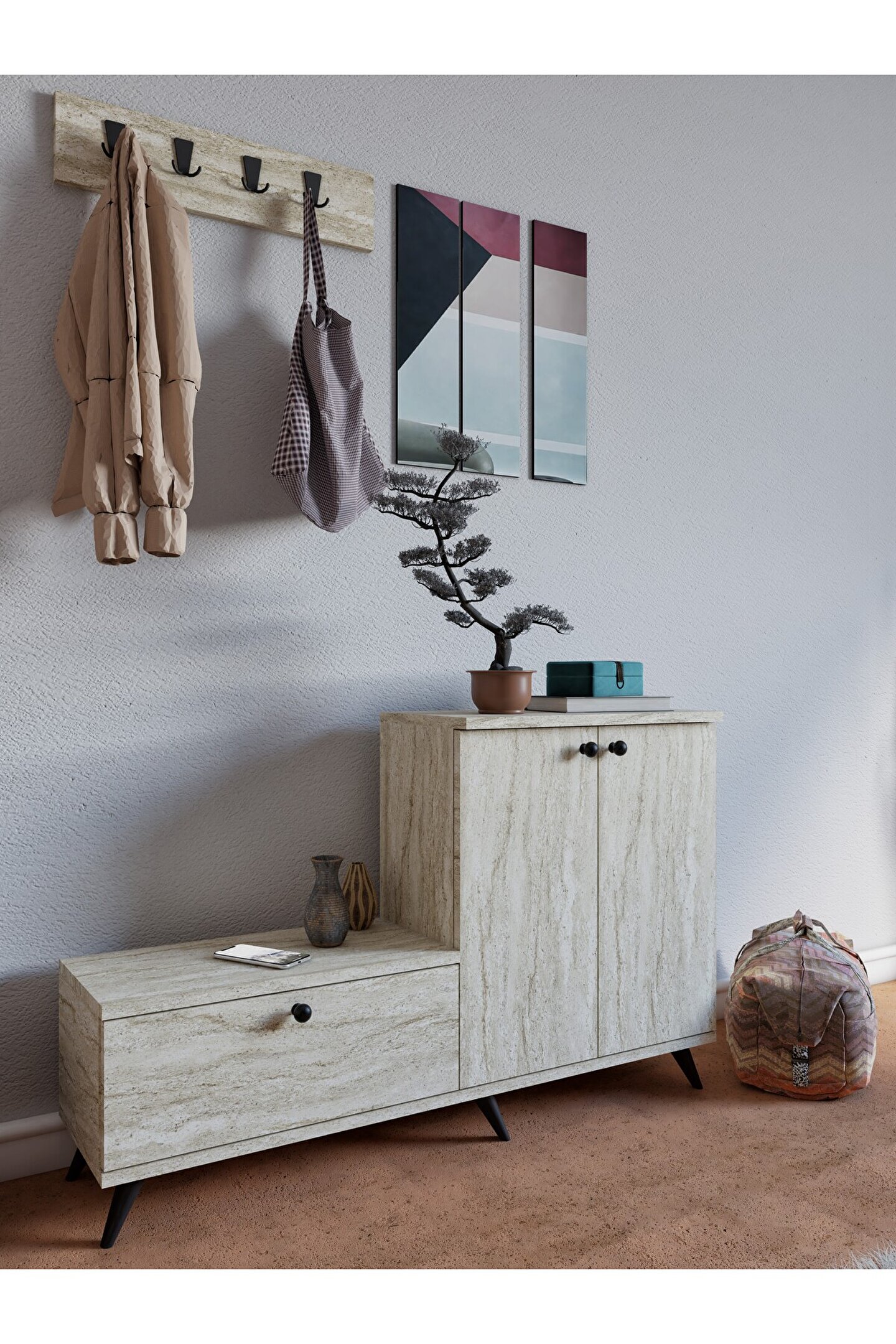 ayakkabılığın üst yüzeyi vazo, anahtarlık ya da çiçek gibi dekoratif objeler için ekstra bir alan olarak tercih edilebilir.