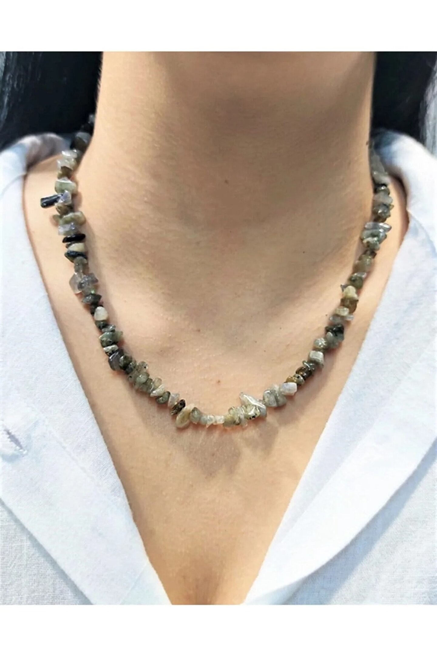 Doğal taş kullanımı sayesinde her kolye benzersiz ve otantik bir görünüm sunar; Labradorit taşı, enerjiyi dengelemeye yardımcı olan ve pozitif titreşimler yayan bir mineraldir; Kolyenin kırıktaş tasarımı, modern ve şık bir stil oluştururken aynı zamanda doğallığı ön plana çıkarır; Taşın doğal yapısı, kolyenin hem günlük kullanım hem de özel günlerde tercih edilebilir olmasını sağlar;