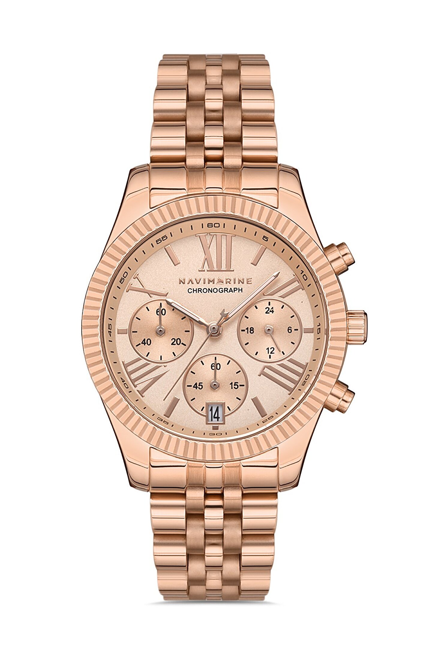 Markası:Navimarine Cinsiyet: Bayan Kadran : Beyaz Kasa: Metal Kasa Rengi: Roz Kasa Şekli: Yuvarlak Kordon: Çelik Kordon Rengi: Metalik Cam:Minarel Garanti: 2Yıl Makine: Pilli Takvim: Var Kronometre Var Ebatı: 38mm Su geçirmezlik:3atm