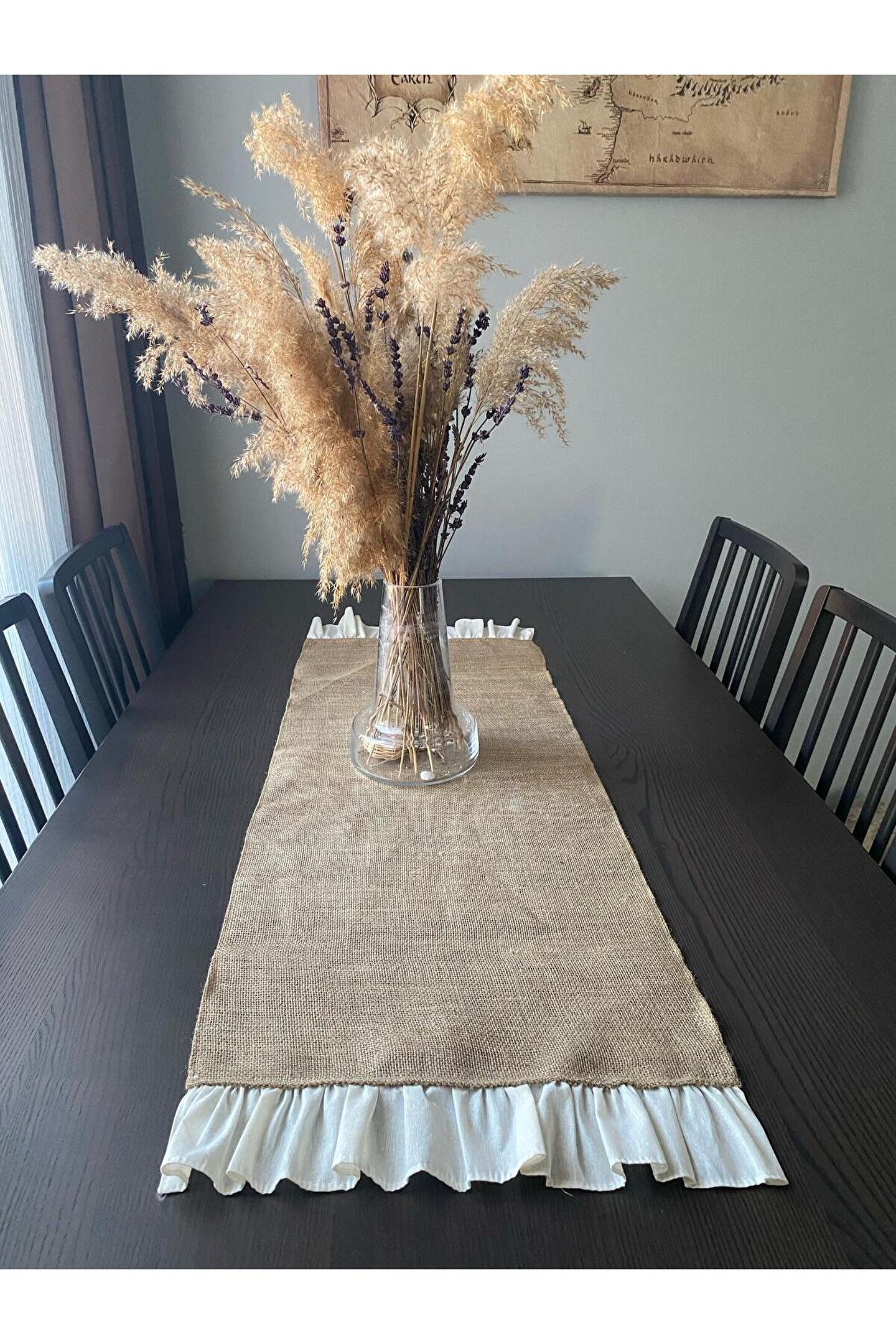 - Doğal jüt malzemesinden üretilmiş, dayanıklı ve uzun ömürlü kullanım sunar.; - 40x120 cm boyutlarındaki dikdörtgen tasarımı ile mekanınıza şık bir görünüm katar.; - Tek parça halinde gelen bu runner, kolayca yerleştirilebilir ve pratik bir dekorasyon seçeneği sağlar.; - Fırfırlı detayları ile modern ve estetik bir dokunuş eklerken, oturma alanlarınıza sıcaklık katmayı başarır.; Ürün tek parça 40x120 olan runner olarak gönderilmektedir.; Görseldeki diğer ürünler dekor amaçlıdır.;