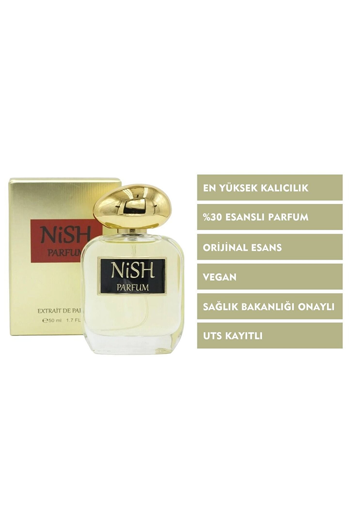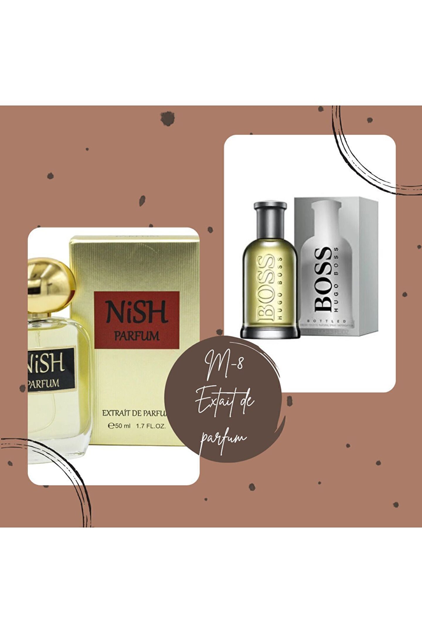 Nish Parfum - Kalıcı ve Eşsiz Parfüm DeneyimiNish Parfum, sizi benzersiz kokularla tanıştırıyor! Kaliteli esanslar kullanılarak özenle üretilen bu parfüm, gün boyu süren kalıcılığı ve çarpıcı kokusuyla fark yaratıyor.; Özel formülü sayesinde her tene uyum sağlar ve unutulmaz bir iz bırakır.; Neden Nish Parfum'ü Seçmelisiniz?Kalıcı Koku: Gün boyu etkileyici bir parfüm deneyimi.; Doğal Esanslar: En kaliteli ve doğal içeriklerle hazırlanmış özel formül.; Unisex Seçenekler: Hem kadınlar hem erkekler için özel olarak tasarlanmış parfüm seçenekleri.; Zarif Şişe Tasarımı: Şıklığıyla göz kamaştıran modern ve zarif şişe tasarımı.; Bu koku, sıradanlıktan uzaklaşıp kendi stilinizi yansıtmanın mükemmel bir yolu! Parfümünüzü tamamlayan sofistike ve çarpıcı bir kokuya sahip olun.; Nish Parfum ile kokunuz da imzanız kadar unutulmaz olsun.; Üst notalar: Lavanta, yeşil elma, nane, greyfurt, fesleğen, Orta notalar: Karanfil, adaçayı, sardunya, yasemin, Alt notalar: Paçuli, köknar, sedir ağacı.; M8 Kodlu Parfum Hgo Boss Muadilidir.; --Extrait De Parfüm En Az %30 Esans Oranı --Yoğun Kalıcı -- Vegan --Sağlık Bakanlığı Onaylı --UTS kayıtlı --HELAL sertifikalı