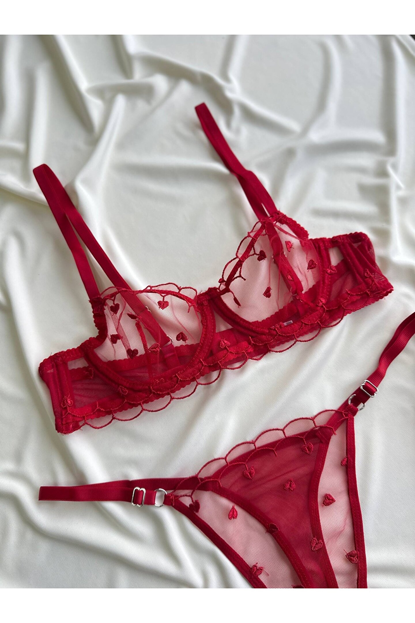 Kırmızı kalp nakış detaylarıyla süslenen bu iç giyim seti, romantik ve modern stilin zarif bir yansımasıdır.; Feminen çizgileri ön plana çıkaran tasarımıyla göz alıcı bir görünüm sunar.; ; Kapsız bralet formu, göğüsleri doğal şekilde sararak gün boyu rahatlık sağlar.; ; Hafif tül ve mesh dokuma kumaşı sayesinde nefes alabilen bir yapı sunar ve her mevsim konforlu kullanım imkânı verir.; ; Sütyen ve tanga olmak üzere 2 parçadan oluşan set, bütüncül ve şık bir iç giyim alternatifi sunar.; ; Normal bel kesimli tanga alt parçası hareket özgürlüğünü desteklerken, esnek bel detayı vücuda uyumlu bir duruş sağlar.; ; Balenli yapısı formu nazikçe şekillendirir.; ; 30 derecede yıkanabilir olması günlük kullanımda kolaylık sağlar.; ; Ürün Detayları: ; • Kırmızı kalp nakışlı özel tasarım ; • Kapsız bralet form – doğal duruş ; • Tül & mesh, hafif ve nefes alabilen kumaş ; • 2’li set: Sütyen + Tanga ; • Normal bel, esnek yapı ;