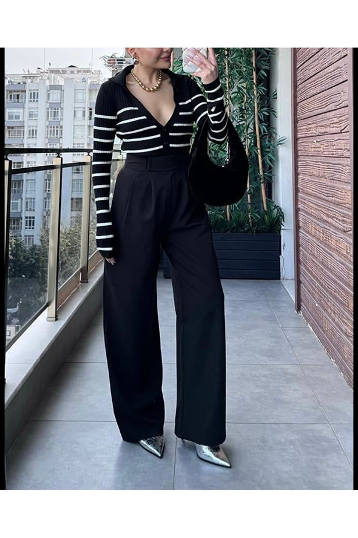 Noa Noa Yüksek Bel Cırt Cırtlı Siyah Bol Paça Cepli En Boy Likralı Rahat Kalıp Kumaş Pantolon Kadın Pileli