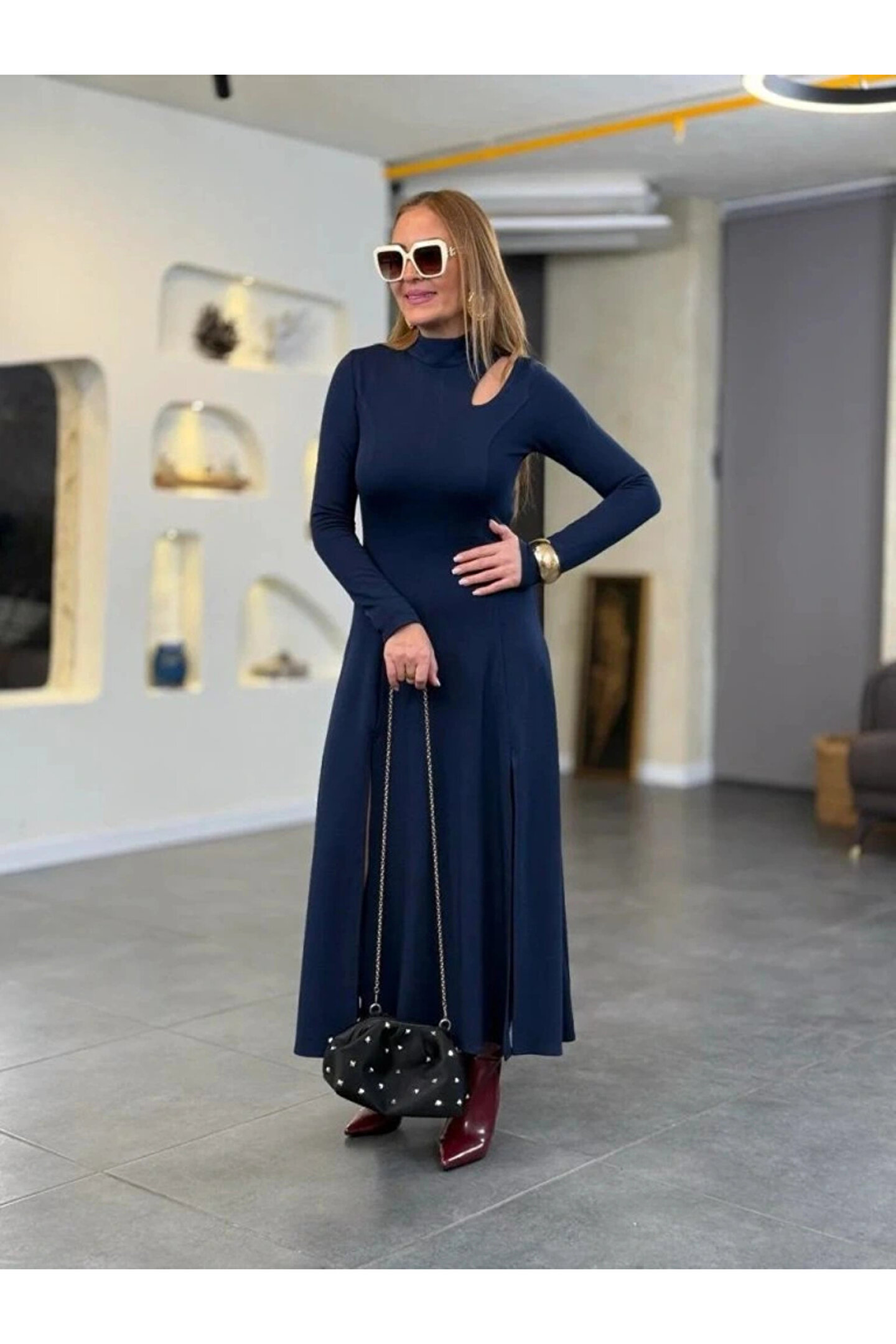 Kadın Balıkçı Yaka Damla Detaylı Yırtmaçlı Uzun Viskon Iki Iplik Maxi Elbise