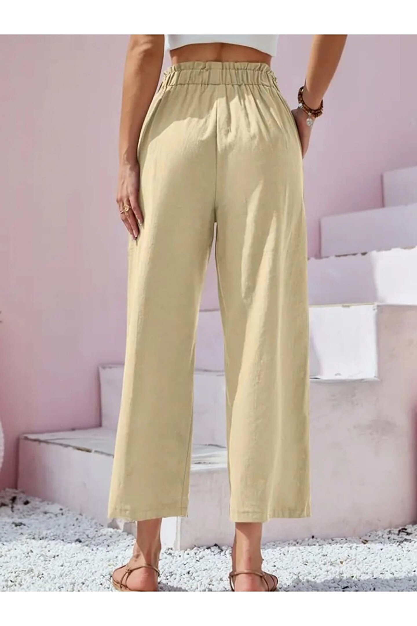 Kadın Bel Büzgü Ve Düğme Detay Kapri Keten Pantolon