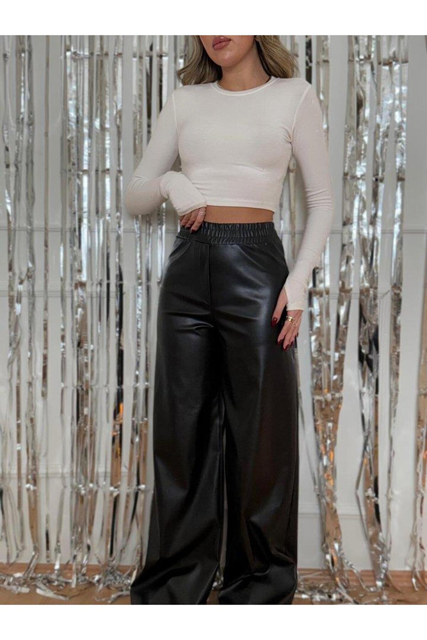 Kadın Yılbaşı özel Yüksek Bel Beli Lastikli Geniş Paçalı Deri Pantolon