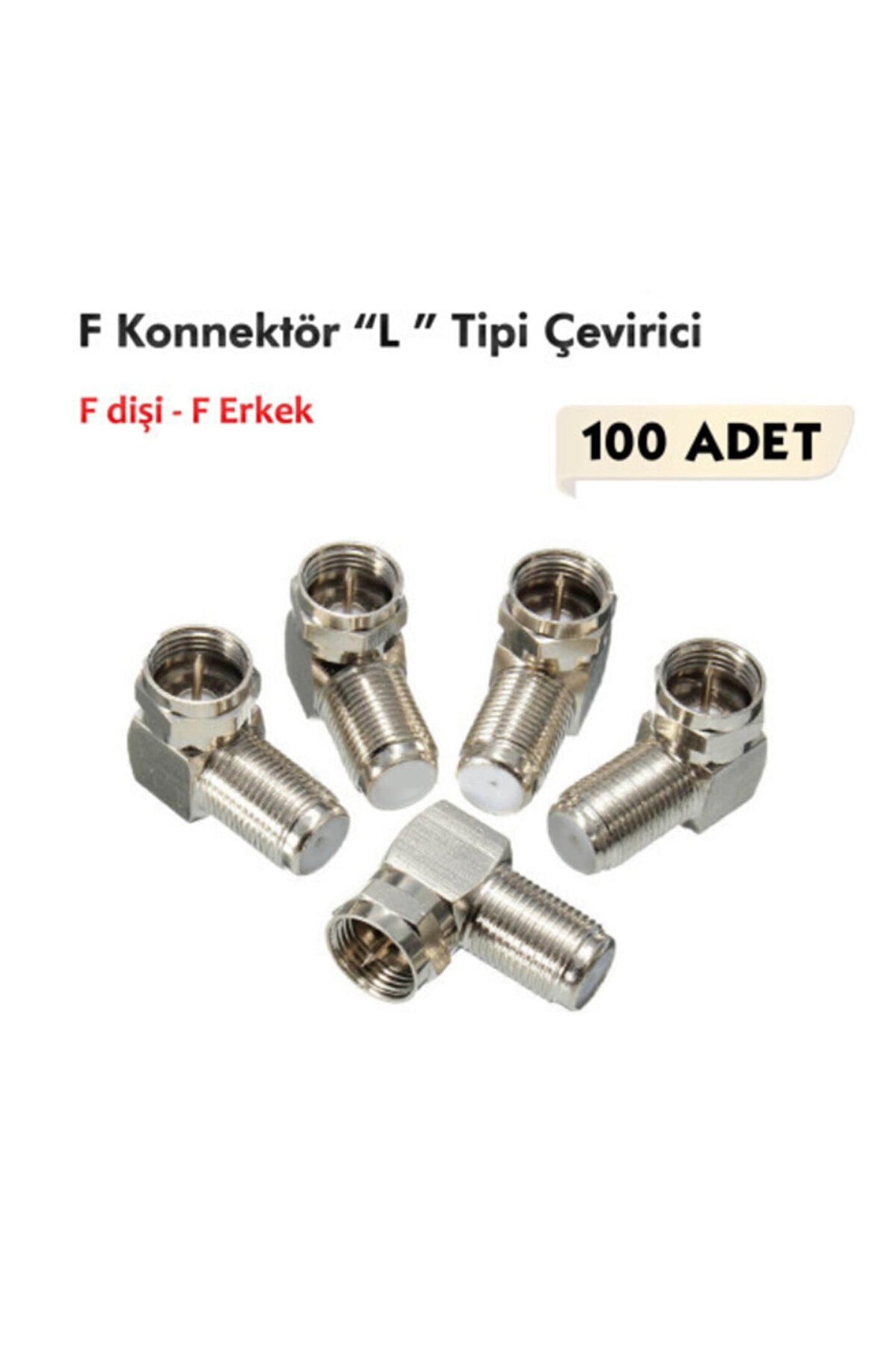 F konnektör l tipi çevirici fiş ( F dişi; F erkek ); 100 adet; l şekli sayesinde kablo kırılmalarını önler; dar alanlarda rahatlıkla kullanabilirsiniz;
