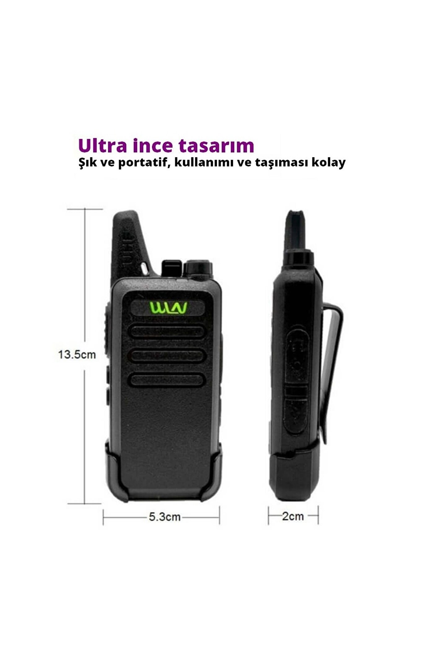 Genel Özellikler: Açık alanda 15 km'ye kadar görüşme imkanı sunan WLN el telsizi, uzun pil ömrü ile güvenlik alanlarında, arama kurtarma, fabrikalar, hava alanları, dağcılık ve arazi işlerinizde rahatlıkla kullanabilirsiniz. 10 saniyeden uzun süre sinyal veya kullanım olmazsa, pil tasarrufu devreye girer. Sinyal alındığında cihaz normal geri moduna döner ve bu sayede pil kullanımından tasarruf edilir. Hafifliği ile öne çıkan WLN el telsizi sadece 200 gr ağırlığa sahip olup yüksek ses çıkış gücü ve ergonomik boyutları sayesinde özellikle tercih edilmektedir. Teknik Özellikler: Frekans Aralığı: PMR446; Çalışma voltajı: Dc 3.7V; Kanal kapasitesi: 16; Anten: Tümleşik dahili anten; Ebatlar: 96*55*22mm; İletim: Çıkış gücü: 0.5W; Maksimum sapma: 2+5Khz; Artık Işıma: <60dB; Akım: 21000mA; Alıcı: Hassasiyet: <0.16pV(12dB SINAD); Squelch Hassasiyeti: <0.2pV; Inter Modülasyon: 50dB; Ses Gücü: 5>300mW; Akım: 2100mA; Squelch Akımı:20mA; Genel Özellikler: Pil ve Şarj Aleti Dahil; Cihazda karışmaları önlemek için QT ve DQT Ton Kod Susturma özelliği bulunmaktadır.; Emsallerine göre daha kaliteli ses çıkış modülasyon özelliğine sahiptir; Düşük basınç, yüksek sıcaklık, düşük sıcaklık gibi farklı hava koşullarında -20 ve +60 derecede çalışabilmektedir; Estetik ve ergonomik bir yapıya sahiptir.; Telsizin üzerinde 16 kanal bulunmaktadır, 16 kanal pmr kanalları yüklü olarak kullanıma hazır.; Cihaz açıldığında yada kanal değiştirildiğinde kanal numarasını sesli olarak bildirebilmektedir; Eller serbest Wox özelliği bulunmaktadır. Yazılımla opsiyonel olarak ayarlanabilir.; Telsizin bel klipsi istenildiğinde el ile rahatça çıkartılıp takılabilecek şekilde tasarlanmıştır; Bataryası li-ion batarya ve 1000mAh kapasiteli etiket üstünde belirtilen değer batarya içindeki pillerin değeri ile aynıdır; Wln el telsizi PMR-446 Mhz lisans gerekmeden kullanılabilen modeldir.; Pil tasarruf özelliği bulunmaktadır.; USB kablosu ile bilgisayardan da şarj edilebilmektedir; Telsiz üzerindeki LED ışık ile alma, gönderme bilgileri takip edilebilir.; Paket İçeriği: 2 Adet WLN KDC-1 El Telsizi; 2 Adet Batarya; 2 Adet Bel Klips; 2 Adet Usb Şarj Kablosu; 2 Adet Usb Şarj Aleti;