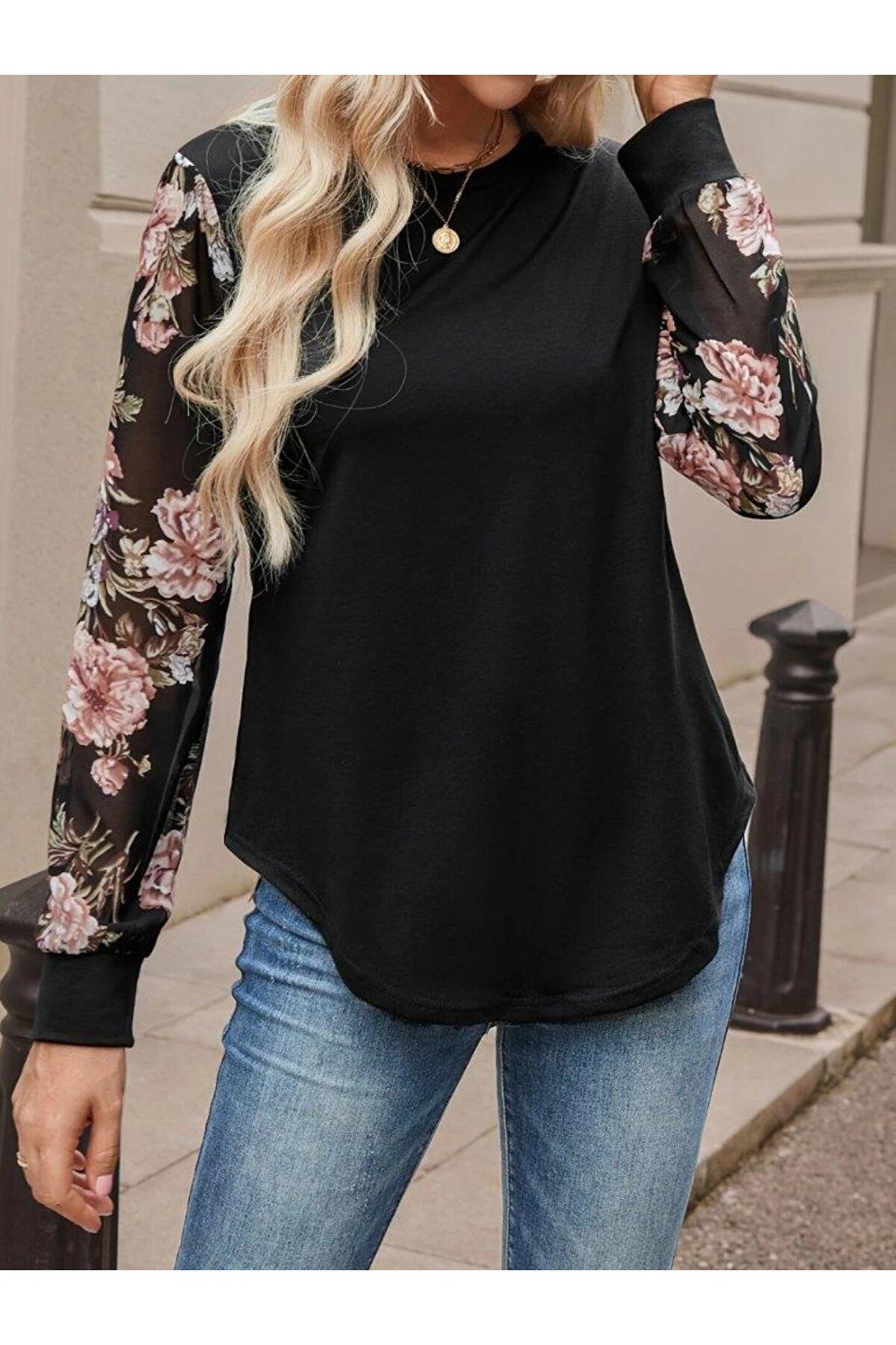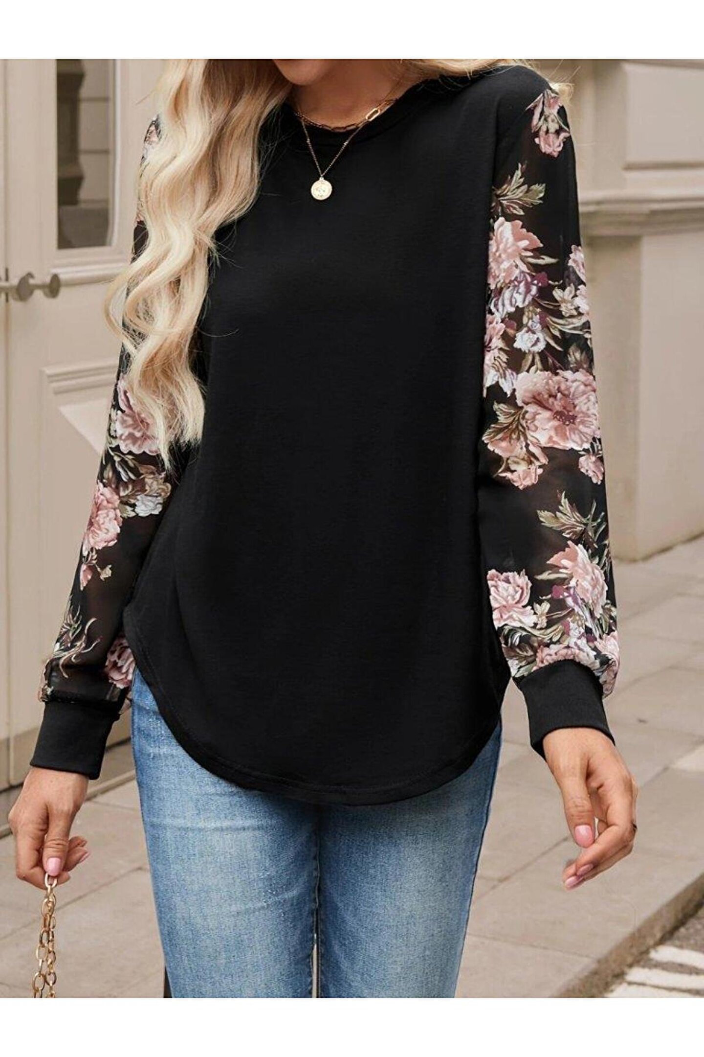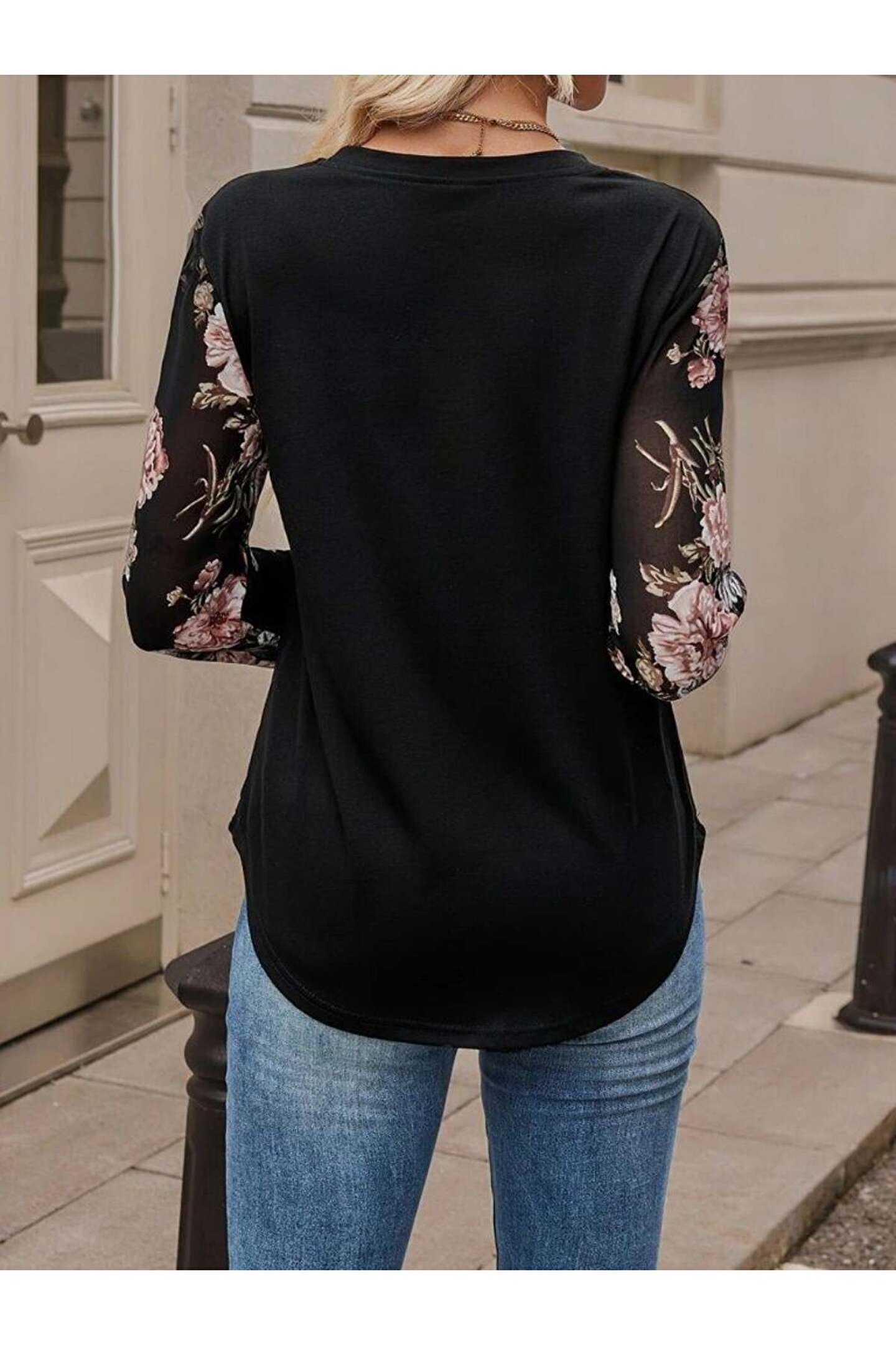 Omarı Kadın Uzun Kollu Bisiklet Yakalı Kolun çiçek Desenli Viskon Iki Iplik Bluz