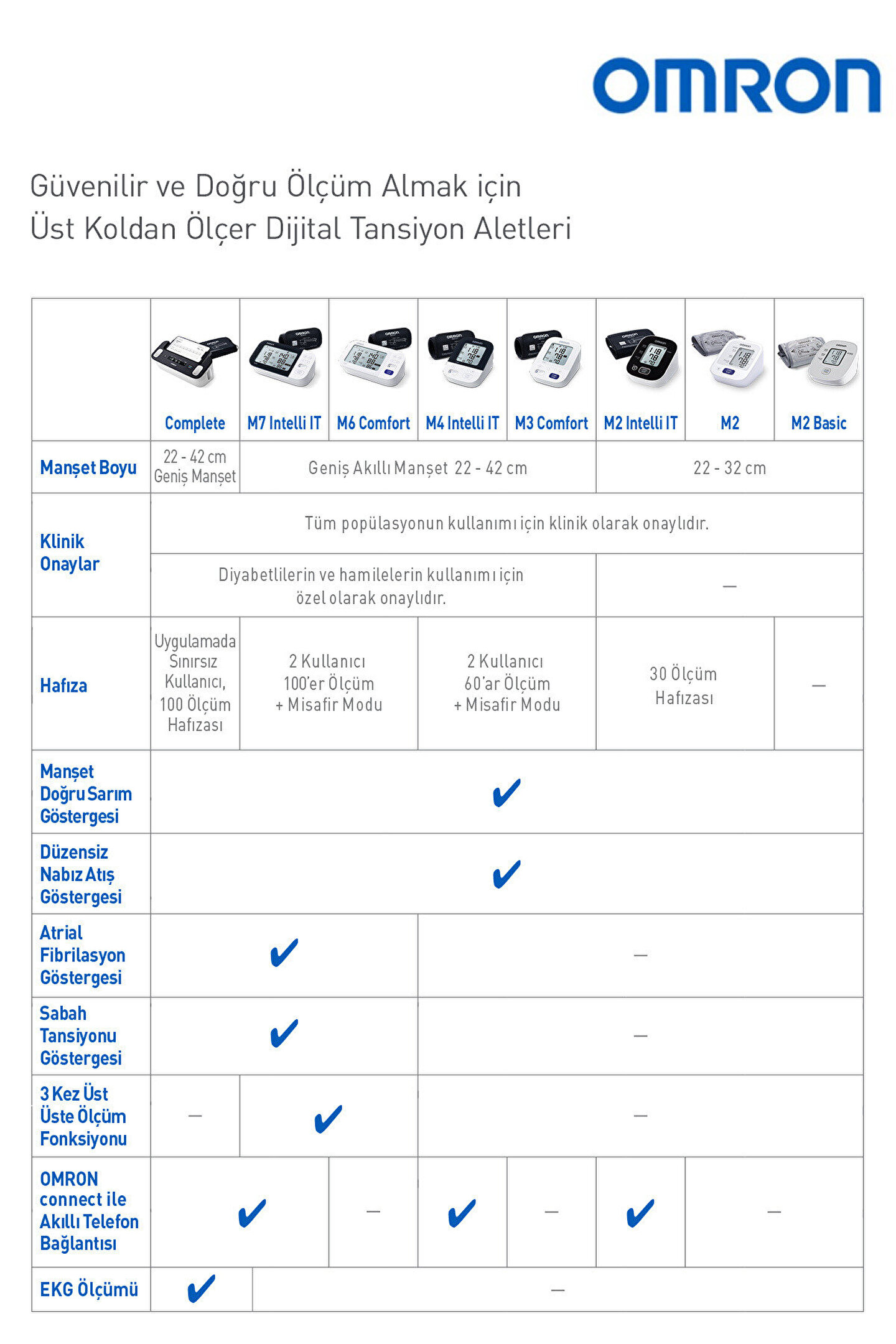MRON Complete akıllı tansiyon ve EKG ölçüm cihazı pilli, tek bir cihazla tansiyon ölçümü ve EKG kaydını bir arada sunan gelişmiş sağlık takip çözümüdür.;Kalp ritim bozukluklarını (AFib, taşikardi, bradikardi) tespit ederken OMRON connect uygulaması sayesinde sonuçlarınızı otomatik olarak telefonunuza aktarabilirsiniz.;Kardiyologların en çok tavsiye ettiği marka¹ olan OMRON, klinik olarak doğrulanmış yüksek doğruluk ve kolay kullanım deneyimi sunar.;Öne Çıkan Özellikler;- Tek Kanallı EKG: Tansiyon ölçümüyle birlikte minimum 30 saniyelik EKG kaydı alır.;- Kalp Taraması: Normal sinüs ritmi, AFib (atriyal fibrilasyon), taşikardi, bradikardi, hipertansiyon ve hipotansiyon tespit eder.;- Vücut Hareketi Algılama: Ölçüm sırasında fazla hareket tespit edilirse kullanıcıyı uyarır.;- Kolay ve Anlık Takip: Net, anlık sonuçlarla düzenli sağlık takibini günlük rutinin bir parçası haline getirir.;- OMRON Connect Uygulaması: Bluetooth ile otomatik veri aktarımı; geçmiş ölçümleri mobil cihazınızdan takip edin.;- Intellisense Teknolojisi: Manşeti gereksiz yere aşırı şişirmeden hızlı ve konforlu ölçüm sağlar.;- Manşet Sarma Kılavuzu: Manşetin doğru sarıldığını gösteren uyarı sistemi.;- Kardiyolog Tavsiyesiyle 1 Numara¹: Avrupa genelinde en çok önerilen tansiyon ölçüm cihazı markasıdır.;- Klinik Olarak Doğrulanmıştır: Tıbbi testlerle onaylanmış ölçüm hassasiyeti.;- Olası AFib Göstergesi: Atriyal fibrilasyon riskini tespit eder.;- Manşet Boyu: 22–42 cm geniş manşet.;- Hafıza: Tek kullanıcı için 90 ölçüm kaydı.;- 5 Yıl Garantili: Uzun ömürlü kullanım ve üretici desteği.;Avrupa genelindeki (EU9) kardiyologların en çok önerdiği tansiyon ölçüm cihazı markası OMRON olmuştur.;Kutu İçeriği;- OMRON Complete Akıllı Ev Tipi Tansiyon ve EKG Ölçüm Cihazı (Ana Ünite);- 22–42 cm Geniş Manşet;- Kullanım Kılavuzu (Türkçe dahil);- Piller (4 Adet AA Pil);- Saklama Kutusu