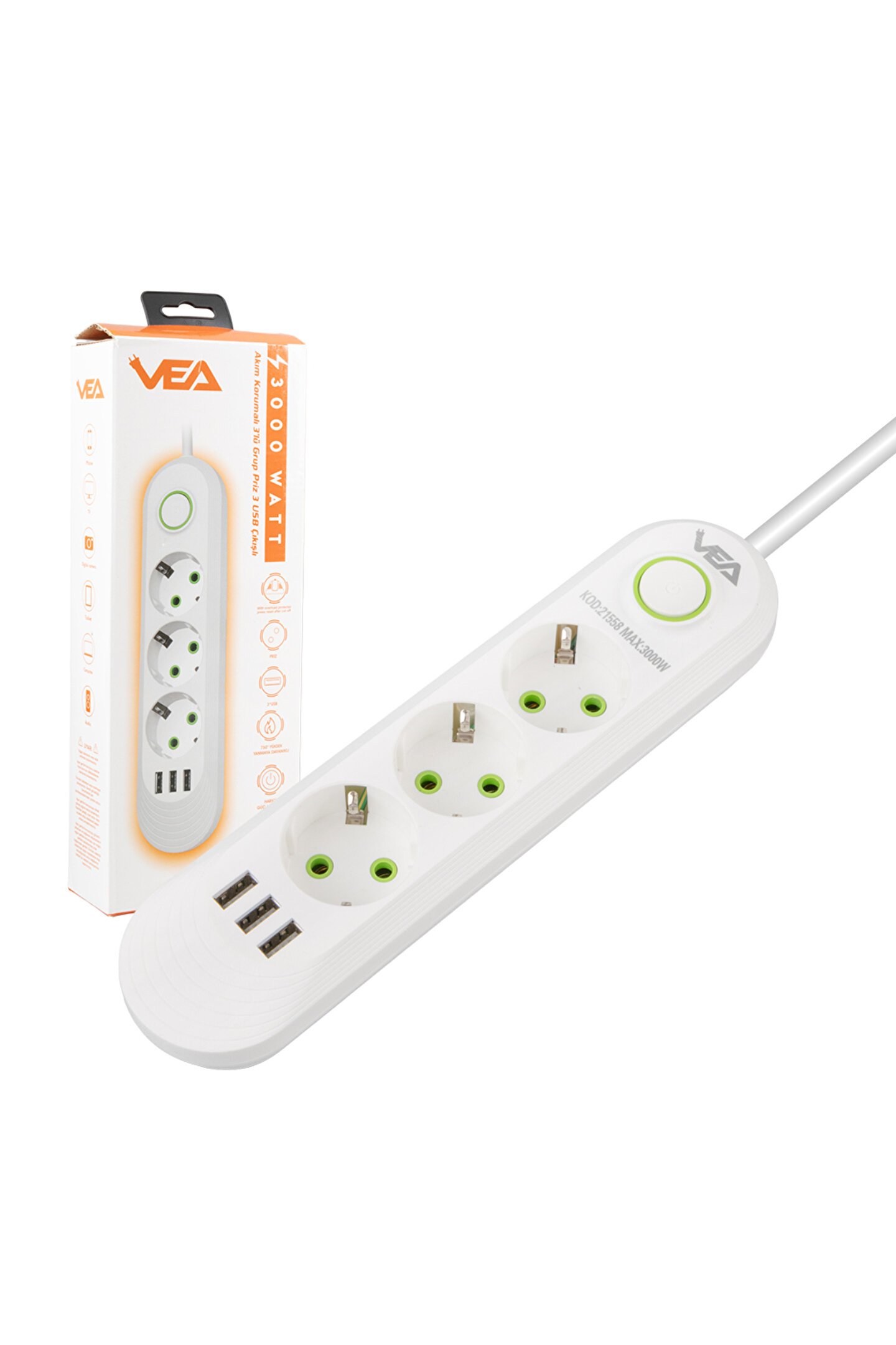 va-21558 3lü 1.5 metre kablo shopzumlu 3 usbli beyaz shopzum akim korumali priz