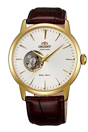 Marka:Orıent Cinsiyet:Erkek Kadran Rengi:Beyaz Otomatik Makine Paslanmaz Çelik Kasa Kasa Çapı = 42mm Deri Kayış: Kahverengi PVD Sarı Kaplama İskelet Kadran 50M Su Geçirmezlik