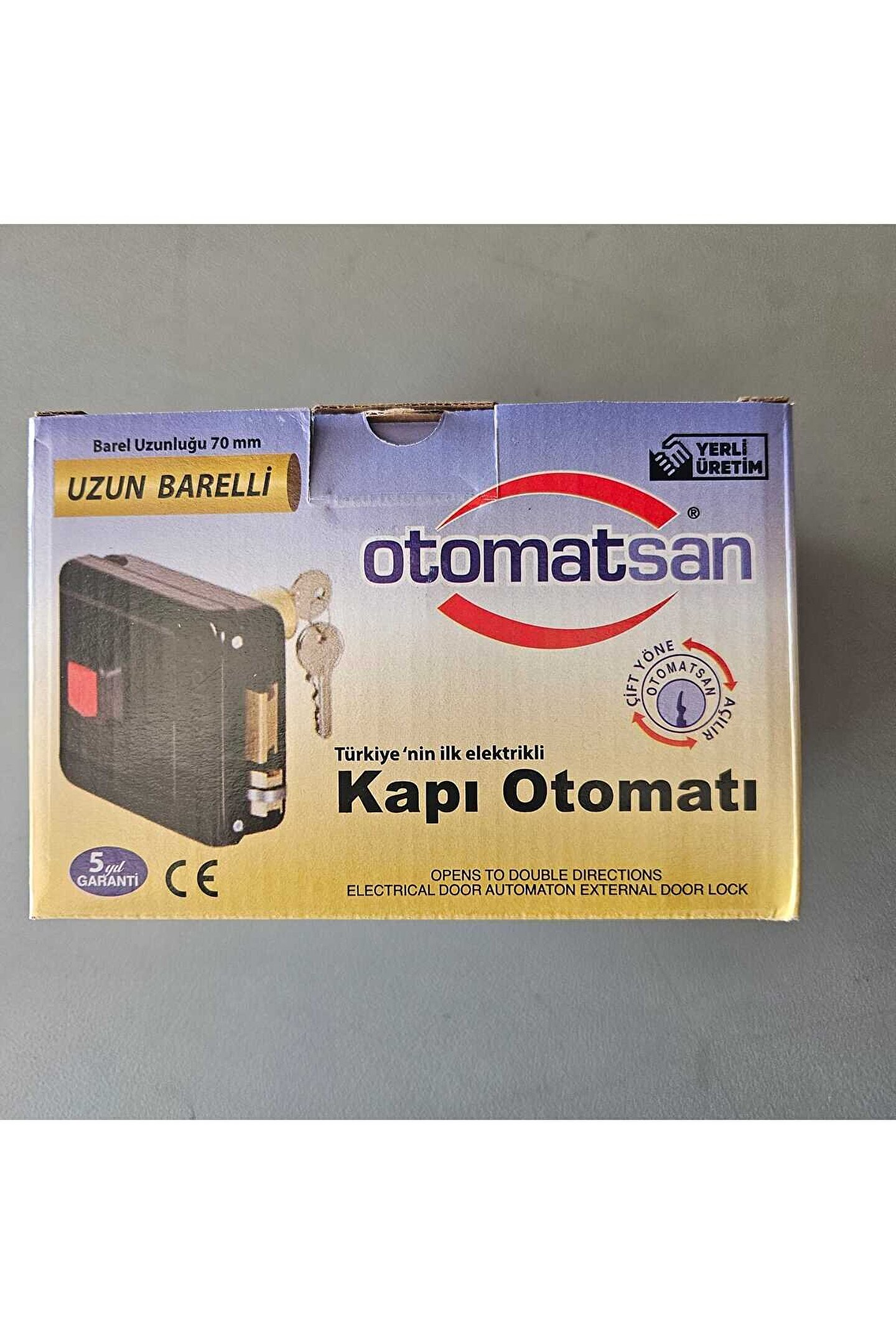 Otomatsan Elektrikli Kapı Otomatı Uzun Barelli 70 Mm Teknik Özellikler : Kendi içinde hem kilit hem de elektrikle açma sistemi olduğundan, ayrıca kapı kilidi, kilit çekme zinciri ve elektrikli kapı otomatiği kullanımını gerektirmez.; Her kapı kapanışında otomatik olarak kurulduğundan, zincirle kurma sistemi ve ayar yoktur.; Kapıyı açmak için butona basıldığında kapı, dışarıdan itilerek sıkıştırılmış olsa bile, bırakıldığında itici dil yardımı ile kolayca açılır.; İçerisinde bulunan bobin koruma devresi sayesinde kapı kapalı iken butona sadece ilk kez basıldığında bir kez çalışır. Butonun takılı kalması veya uzun süreli basılması durumunda etkilenmediği için sessiz çalışarak çevreyi rahatsız etmez.; Elektrik Bağlantısı : Kapı otomatının çalışması için 8-12 V., 10W. güç gereklidir. Ülkemizde yaygın kullanılan 5Wlık zil transformatörleri ile çalıştırılamaz. Özellikle çok katlı binalarda şebeke voltajının düşmesi ve kablolardaki gerilim kayıpları dikkate alınarak üretilen otomatsanı 15W lık TR-15 veya 50Wlık TR-24 güç transformatörleri ile kullanılması önerilir.; Tirajlı kilit , apartman kapısı kilidi ve demir kapı kilidiolarak da geçer. Çift yönede açılabilir Elektrikli özelliği de eklenince butonla yada içeride birdüğme veya anahtar vasıtasıyla yada daire otomatları ile de açılabilir. Kaynakla veya vida ile montaj yapılabilir Kilit karşılığı ve anahtarı içindedir. Uzun ömürlü Üretim Hatalarına Karşı Garantili