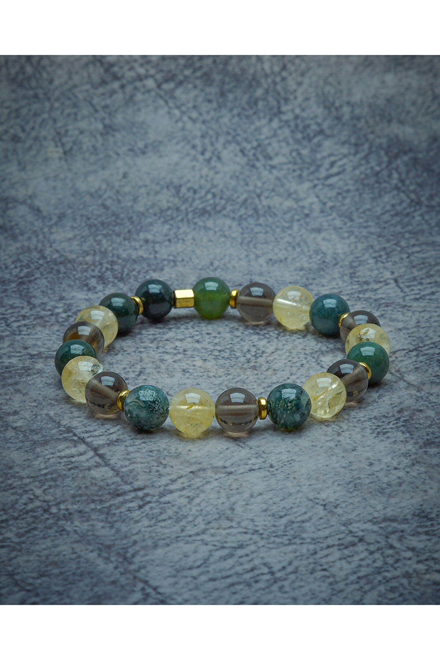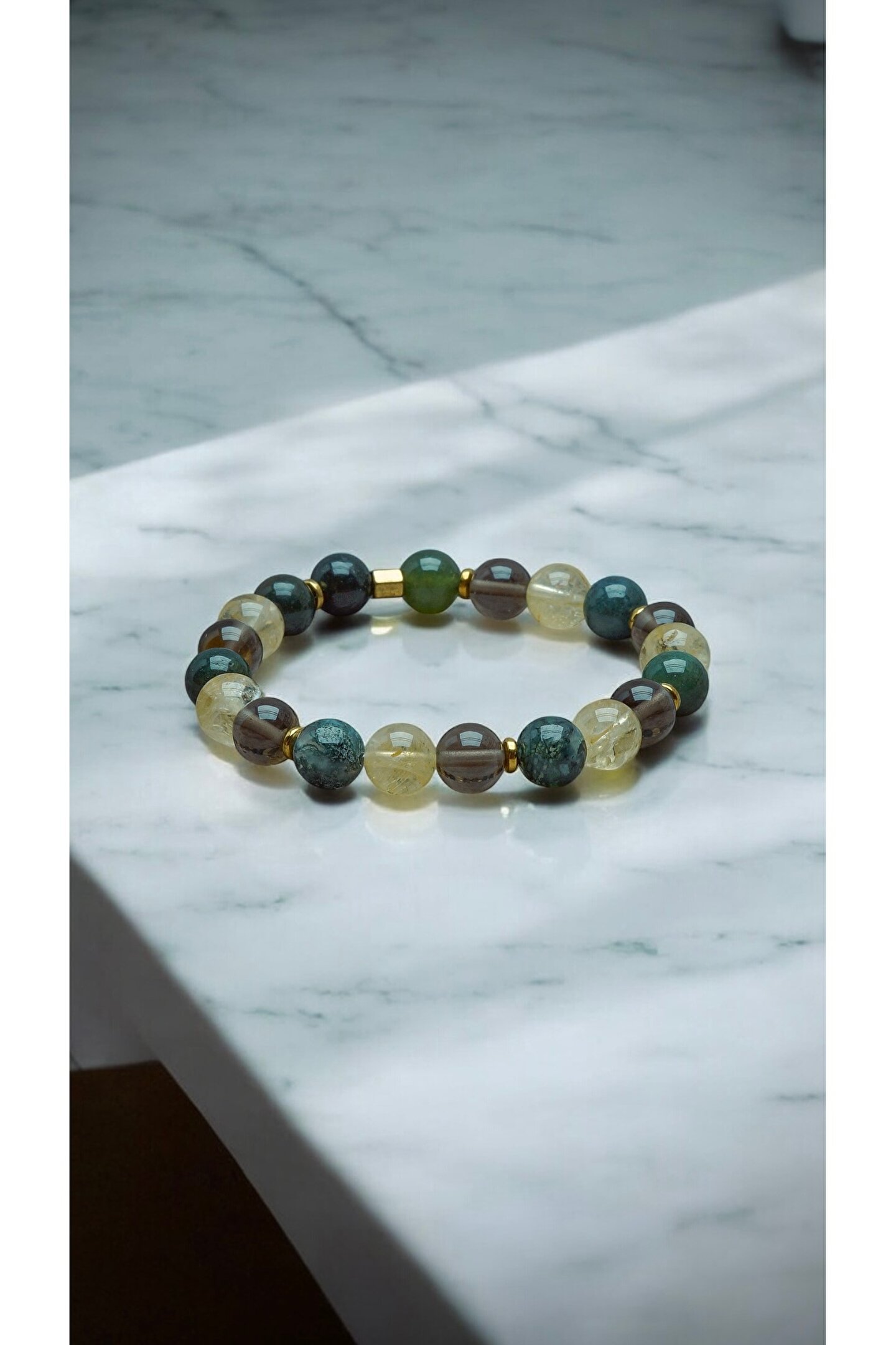 Bu bileklik, güçlü ama zaman zaman iç dünyasında zorlanan Başak burcuna denge ve şifa sunmak amacıyla tasarlandı.; İçeriğindeki Sitrin taşı, Başak ın sürekli çalışan zihnine neşe, canlılık ve özgüven kazandırırken, aynı zamanda pozitif enerji ve bolluk çekerek ruh halini dengeler.; Dumanlı Kuvars, negatif enerjiyi dönüştürme ve topraklama özelliğiyle, Başak ın kendine yönelttiği aşırı eleştiriyi yumuşatır ve zihinsel sakinlik sağlar.; Yosun Akik ise doğayla olan bağını güçlendirerek, stresin ve zihinsel yorgunluğun azalmasına yardımcı olur; huzurlu, yumuşak bir enerji yayar.; Bu üç taşın uyumu, Başak burcunun analitik zek sını, üretkenliğini ve içsel huzurunu dengeli bir enerji akışıyla buluşturur.; Bilek çevrenizi ölçmek için bir mezureyi bileğinizin en geniş yerine, çok sıkmadan ancak tam oturacak şekilde dolayın.; Mezurenin başlangıç noktası ile birleştiği yeri okuyarak ölçünüzü belirleyin.; Eğer mezureniz yoksa, bir ip veya şerit kullanarak bileğinizi ölçüp, ardından bir cetvelle uzunluğunu belirleyebilirsiniz.; Doğal taşlar, yüzyıllardır farklı kültürlerde enerjileri ve faydalı etkileriyle tanınmış ve kullanılmıştır.; Ancak bu etkiler kişisel inanç, deneyim ve algıya bağlı olarak değişiklik gösterebilir.; Bu taşların doğal güzellikleri ve eşsiz enerjileri, günlük yaşamınıza estetik ve anlam katabilir.