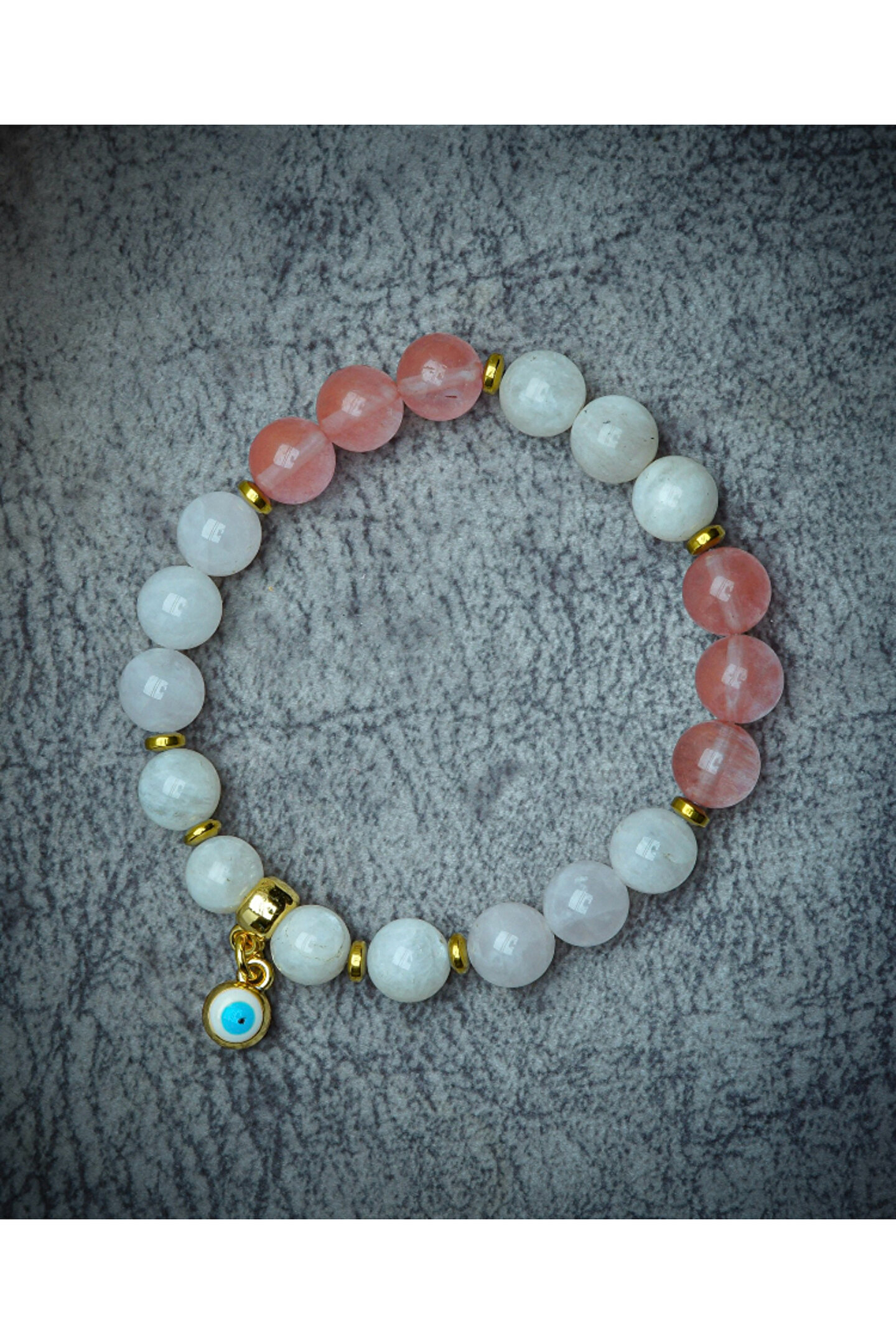 Ay taşı, pembe kuvars ve gül kuvarsın yumuşak enerjileriyle tasarlanan bu özel bileklik; kalbinizi sevgiye, huzura ve içsel dengeye açmak için yanınızda.; Ay taşı, duygusal dengeyi desteklerken sezgilerinizi güçlendirir.; Pembe kuvars, kalbi şefkatle ve sevgiyle bağ kurmayı kolaylaştırır.; Gül kuvars ise hem kendinize hem çevrenize karşı sevgi dolu bir bakış geliştirmenize yardımcı olur.; Aşk ya da kısmet arayışında olun ya da olmayın; bu bileklik, kalpten gelen niyetlerle atılan her adımda sizi desteklemek için tasarlandı.; Bilek çevrenizi ölçmek için bir mezureyi bileğinizin en geniş yerine, çok sıkmadan ancak tam oturacak şekilde dolayın.; Mezurenin başlangıç noktası ile birleştiği yeri okuyarak ölçünüzü belirleyin.; Eğer mezureniz yoksa, bir ip veya şerit kullanarak bileğinizi ölçüp, ardından bir cetvelle uzunluğunu belirleyebilirsiniz.; Doğal taşlar, yüzyıllardır farklı kültürlerde enerjileri ve faydalı etkileriyle tanınmış ve kullanılmıştır.; Ancak bu etkiler kişisel inanç, deneyim ve algıya bağlı olarak değişiklik gösterebilir.; Bu taşların doğal güzellikleri ve eşsiz enerjileri, günlük yaşamınıza estetik ve anlam katabilir.