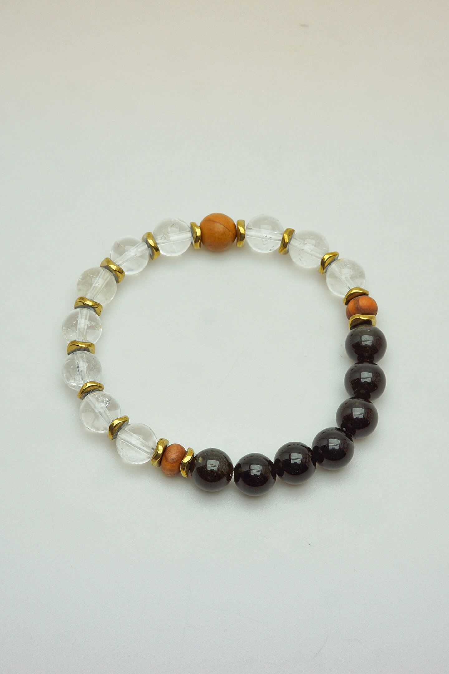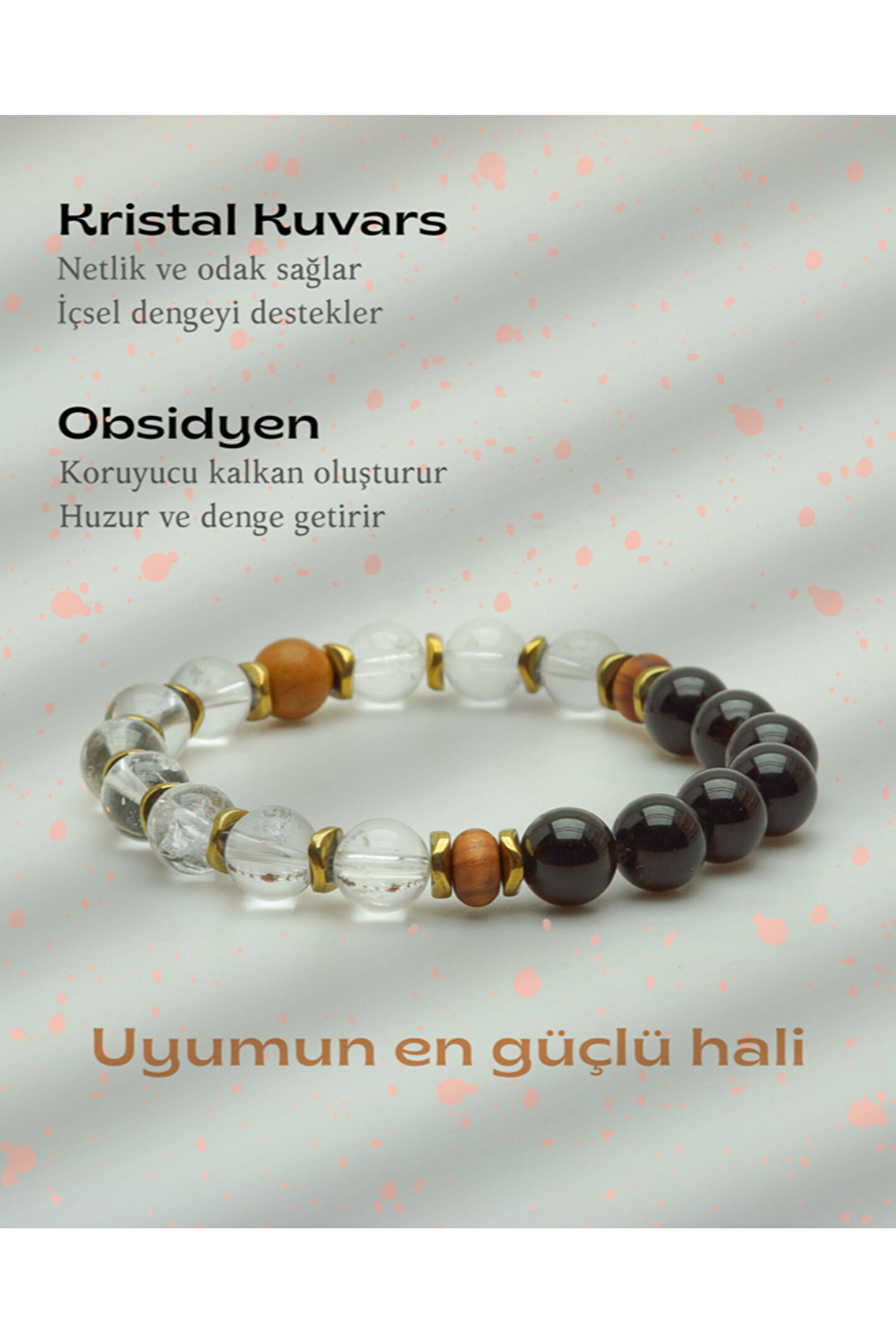 Kristal kuvars, doğadaki en özel taşlardan biridir.; İçindeki piezoelektrik özelliği sayesinde saniyede 32.768 kez titreşir.; Bu sebepten saatlerde hassasiyetin sembolü olmuştur.; Saatlerde bulunan QUARTZ yazısı, o saatte kuvars taşının bulunduğunu gösterir.; Kristal kuvars, piezoelektrik özelliği sayesinde yalnızca saatlerde değil; bilgisayar, telefon, radyo ve GPS gibi birçok teknolojide de kullanılır.; Bu taş, düzenli titreşimleriyle modern yaşamın görünmez ama vazgeçilmez parçalarından biridir.; Aynı düzeni ve dengeyi taşıyana da yansıttığına inanılan kristal kuvars bileklik, netlik, odak ve uyum isteyenler için güçlü bir yol arkadaşıdır.; Obsidyen, eski çağlarda keskinliğiyle alet yapımında, Aztekler döneminde ise ayna ve kehanet aracı olarak kullanılmıştır.; Bugün kişinin üzerinde taşıdığında koruyucu ve arındırıcı etkisiyle bilinir.; Bu iki taşın bir araya gelmesiyle ortaya çıkan uyum bilekliği, koruma ve dengeyi bir arada sunar.; Obsidyenin güçlü kalkanı ile kristal kuvarsın berrak enerjisi birleşerek taşıyana hem içsel huzur hem de yaşamın farklı alanlarında uyum içinde ilerleme imkânı verir.; Günlük yaşamda destekleyici bir yol arkadaşıdır.;