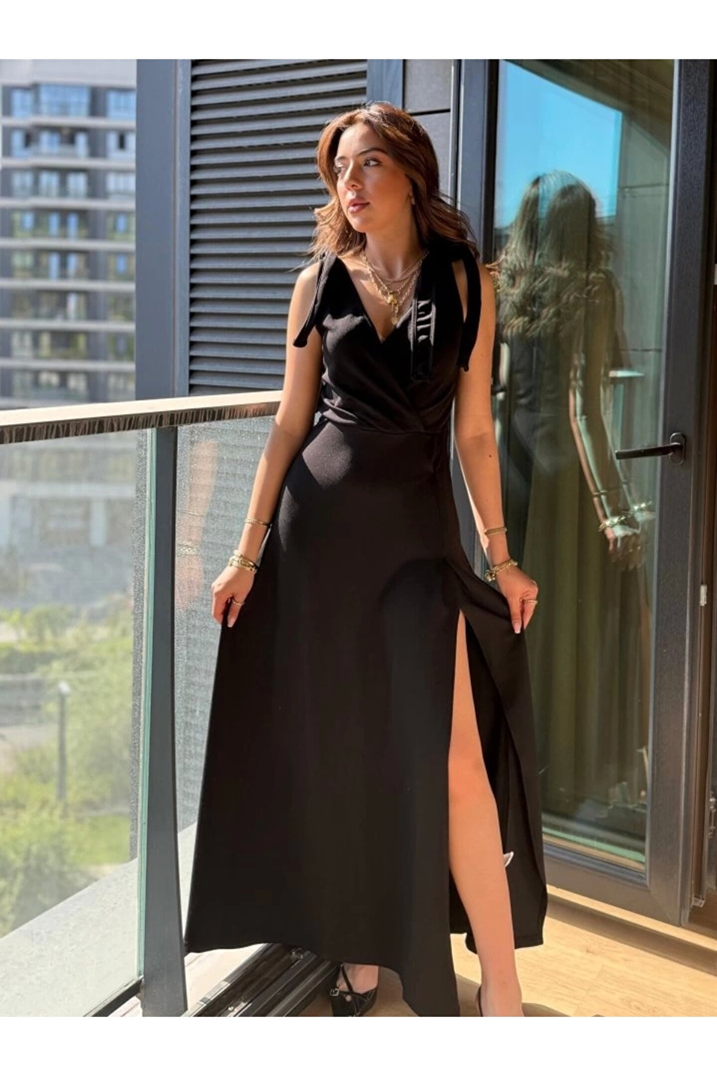 Kadın Askılı Omuzdan Bağlamalı Kruvaze Yakalı Uzun Yırtmaçlı Janjan Krep Elbise