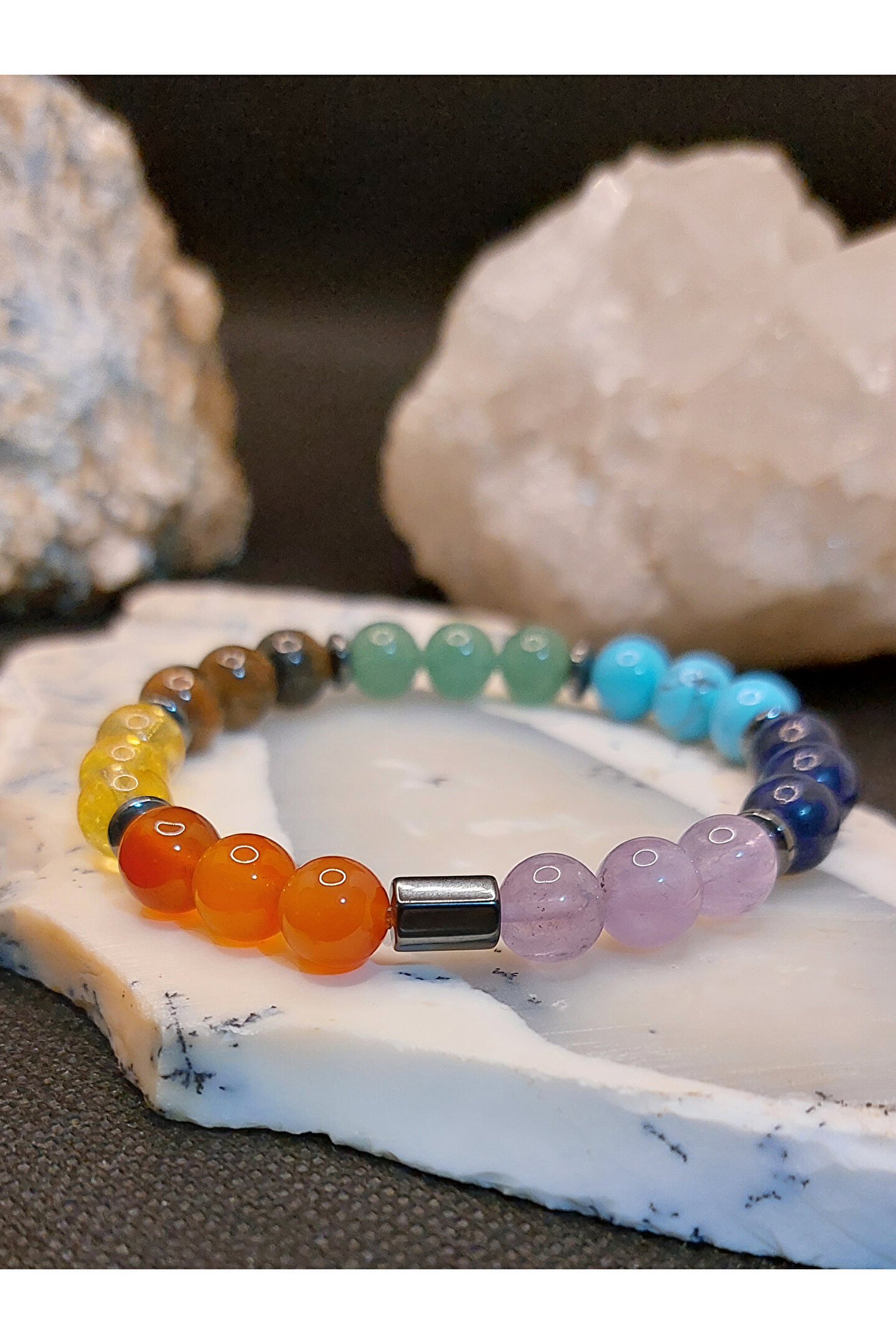 Çakra taşları ya da şifa kristalleri, bu enerji tekerlekleriyle en çok etkileşime girebilen taşlardır. ; Bu taşların yaydığı titreşimler çakraların hizalanmasına yardımcı olur. ; Çakra taşları, çakranın doğal iyileşme sürecini destekleyen, çeşitli renklerde farklı taş türleridir. ; Size sunmuş olduğumuz ÇAKRA BİLEKLİK, 7 farklı renge sahip gerçek değerli doğal taşların birleştirilmesi sonucu hazırlanmış eşsiz bir üründür. ; Siz değerli takipçilerimize, isteğiniz doğrultusunda göndereceğimiz ÇAKRA bilekliğinde mevcut olan değerli doğal taşların özellikleri aşağıda sıralanmıştır. ; Ametist: Ametist, birkristal taşıdır ve genellikle mor renkte bulunur. ; Ametist, kristal yapısınedeniyle özellikle enerji düzenleme, meditasyon ve kişisel gelişim içinkullanılır. ; Aynı zamanda, ametist taşı , stresi azaltmaya, dikkat vekonsantrasyonu arttırmaya ve duygusal dengeyi sağlamaya yardımcı olur. ; Lapis Lazuli: Lapislazuli, doğru iletişimi ve anlayışı geliştirmeye yardımcı olur. ; Bukristalle çalışmak kişinin sezgilerini güçlendirirken, içsel düşünce veduygularınızla bağlantı kurmayı sağlar. ; Antik Mısır ve Roma'da güçlü bir tılsımolduğu, ruhu kötülüklerden arındırdığına inanılırdı. ; Turkuaz: Kişiye şansve uğur getirdiği bilinmektedir. ; Kaygı duygusuna karşı etkilidir. ; Başarıgetirir. ; Nazara karşı koruyucu etkisi vardır. ; Tansiyonu dengeler. ; Kalphastalıklarına karşı koruyucu etkisi vardır. ; Takı olarak kullanıldığı takdirdeetkisi daha da artmaktadır. ; Aventurin: Aventurintaşı, kuvars ailesinden bir taş olup, birçok faydası vardır. ; Taşın en önemlifaydaları arasında duygusal dengeleme, zihin açıklığı ve fiziksel sağlık bulunur.Aventurin taşı, stresi azaltmak ve ruh halini dengelemek için kullanılabilir.Ayrıca, zihni sakinleştirmeye ve odaklanmaya yardımcı olur. ; Kaplangözü: Kaplan gözü kişiyeazim, denge, cesaret ve sezgisel yetenekleri arttırmada güç verir. ; Motivasyonsağlar ve hem iç hem de dış huzuru ortaya çıkarmada destek olur. ; Korku,kıskançlık gibi duyguları dengelemeyi sağlar. ; Endişe ve stres gibi faktörlerinüstesinden gelmek için faydalıdır. ; Sitrin: Bolluk vebereketi kendisine çektiğine inanılır. ; Özgüven problemi yaşayanlar içinidealdir. ; Kişiye ilham ve motivasyon verir. ; Güneşle ilişkilendirilmesindendolayı, yaşam enerjisi ve mutluluğun taşıdır. ; Etrafına pozitif enerji yayar. ; Başarınıntaşıdır. ; Zihni arındırarak, hedefe odaklanmayı sağlar. ; Akik: NegatifEnerjilerden Korur. ; Akik taşı, insanları negatif enerjilerden korumak içinkullanılan bir taştır. ; Stresi Azaltır. ; Güçlü Bir Enerji Verir. ; İletişimiArtırır. ; . ; Kendine Güveni Artırır. ; ZihinselNetliği Artırır. ; Şık ve eşsiz Görünüm Sunar. ; Önemli not:Doğal taşlar yapıları gereği farklı renk ve ebatlarda olabilmektedir. ; Ürünlerimiz, gerçek doğal taşlardan özenle hazırlanmaktadır. ; Müşteri memnuniyeti, önceliğimizdir..;
