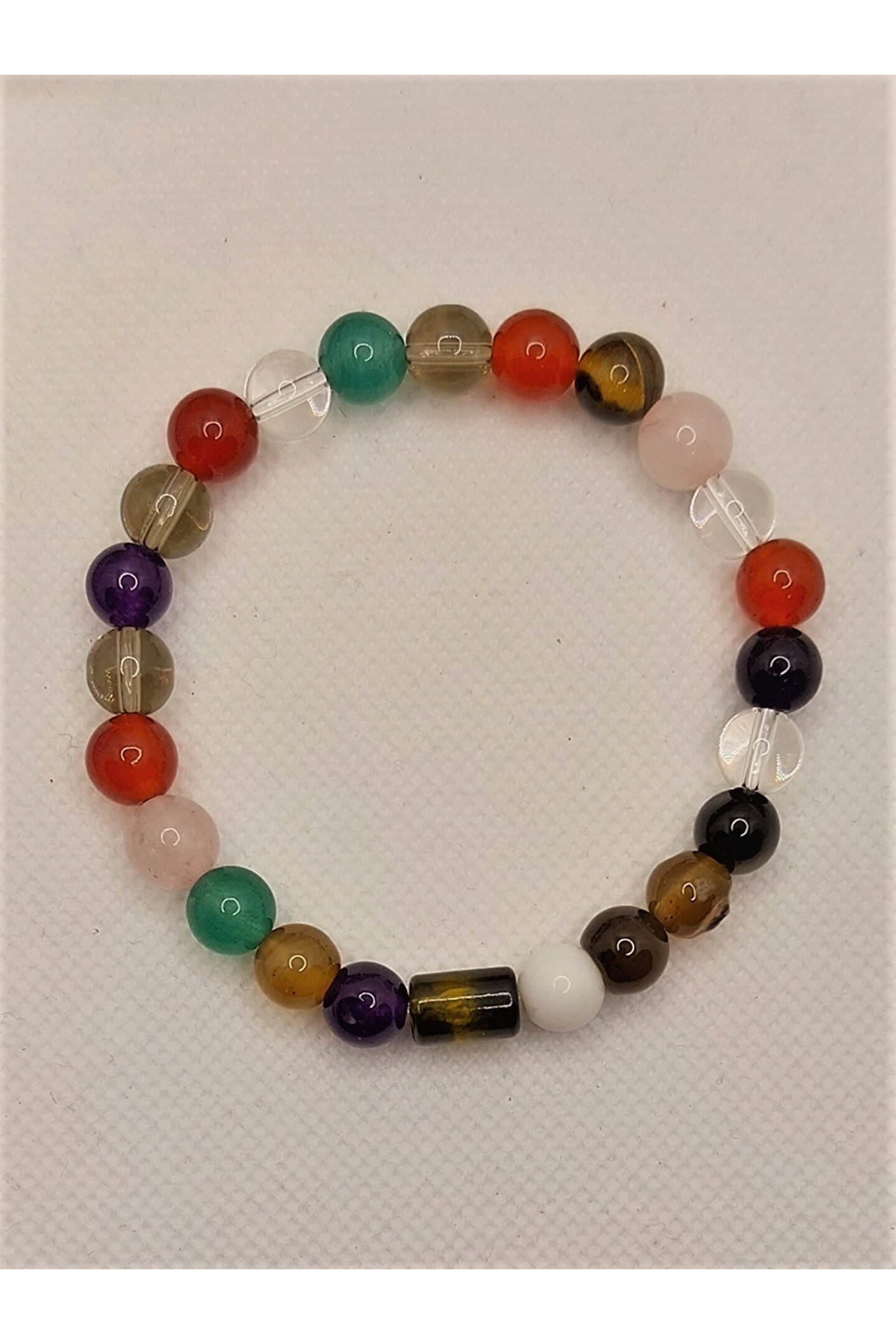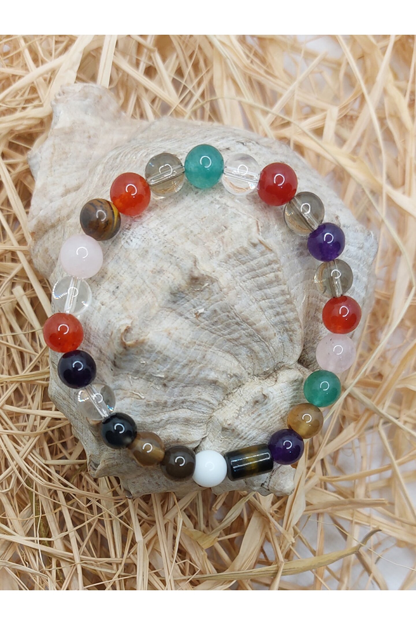 Doğal taş bileklik, şıklığınızı tamamlayacak zarif bir aksesuardır; Karışık kuvars ve sıkma kehribar kullanımı, bilekliğe benzersiz bir dokunuş katıyor; Her bir bileklik, el yapımı olup özgün bir tasarım anlayışını yansıtır; Doğal taş materyali sayesinde her parça eşsiz ve otantik bir görünüm sunar; Günlük kullanım için ideal olan bu bileklik, hem rahatlığı hem de estetiği bir arada sunar;
