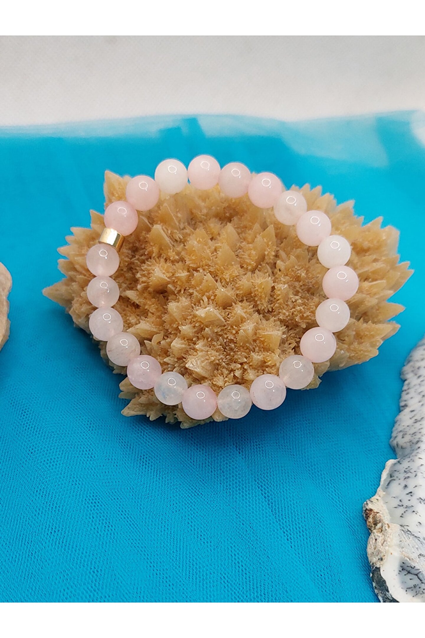 Doğal taş bileklik, şıklığınızı tamamlayacak zarif bir aksesuar seçeneği sunar; Pembe kuvars taşı, bilekliğinize benzersiz bir renk ve enerji katarken, doğal güzelliğiyle dikkat çeker; Taş materyali sayesinde uzun ömürlü kullanım ve dayanıklılık sağlar;