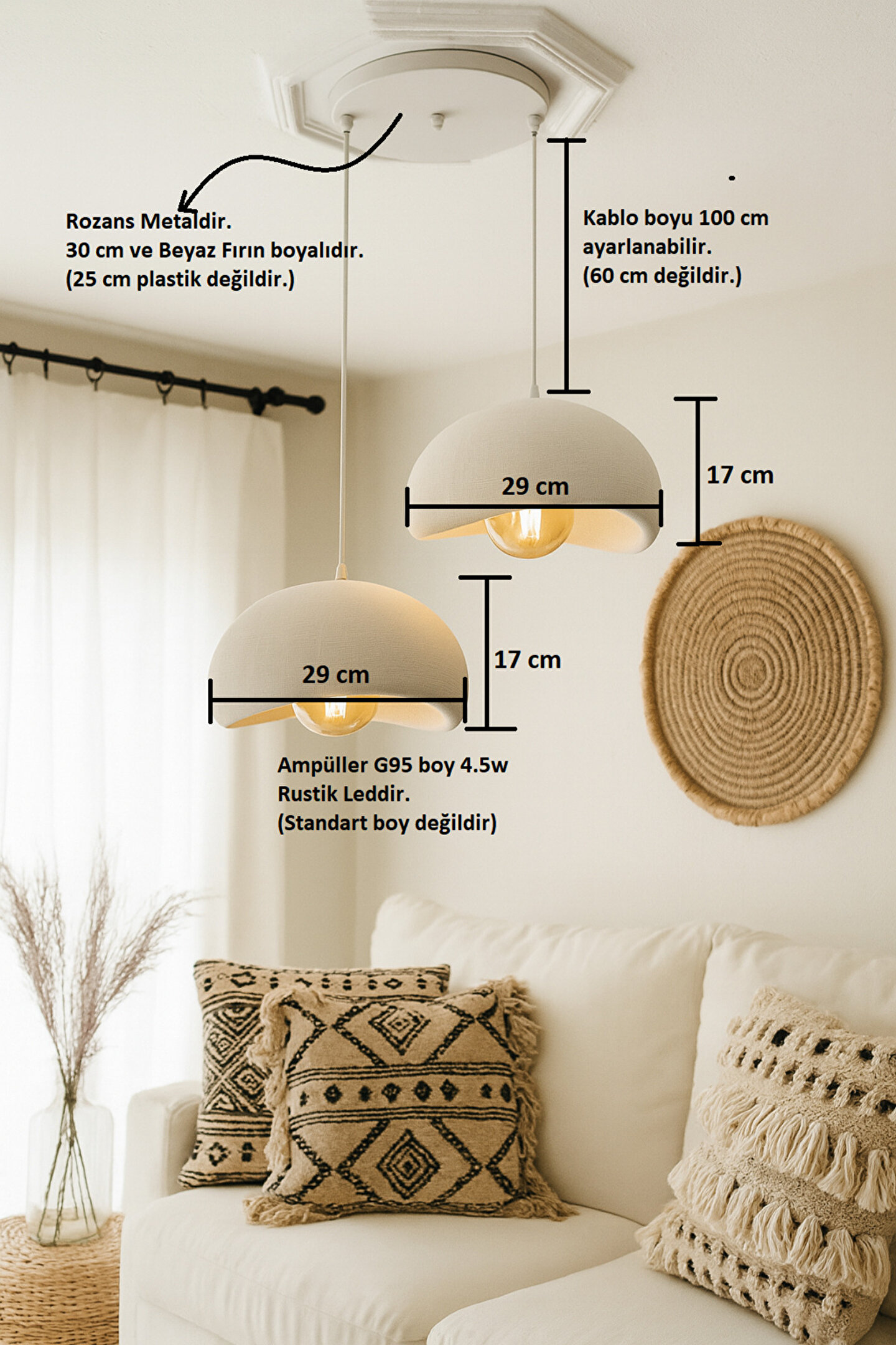 - Salon ve oturma odanızda modern bir dokunuş sunan beton görünümlü 2'li sarkıt avize, rustik detaylarıyla dikkat çeker.; - 101 ila 120 cm arasında ayarlanabilir yüksekliği sayesinde farklı mekanlara kolayca uyum sağlar.; - İki adet E27 ampul ile donatılmış olup, enerji tasarrufu sağlayan A+ sınıfı LED ampullerle birlikte gelir.; - Dayanıklı plastik materyaliyle uzun ömürlü kullanım vaat ederken, beyaz rengiyle her türlü dekorasyona zarif bir katkı sağlar.; - LED teknolojisinin sunduğu parlak ve net aydınlatma ile mekanlarınıza sıcaklık katarken enerji tüketimini optimize eder.