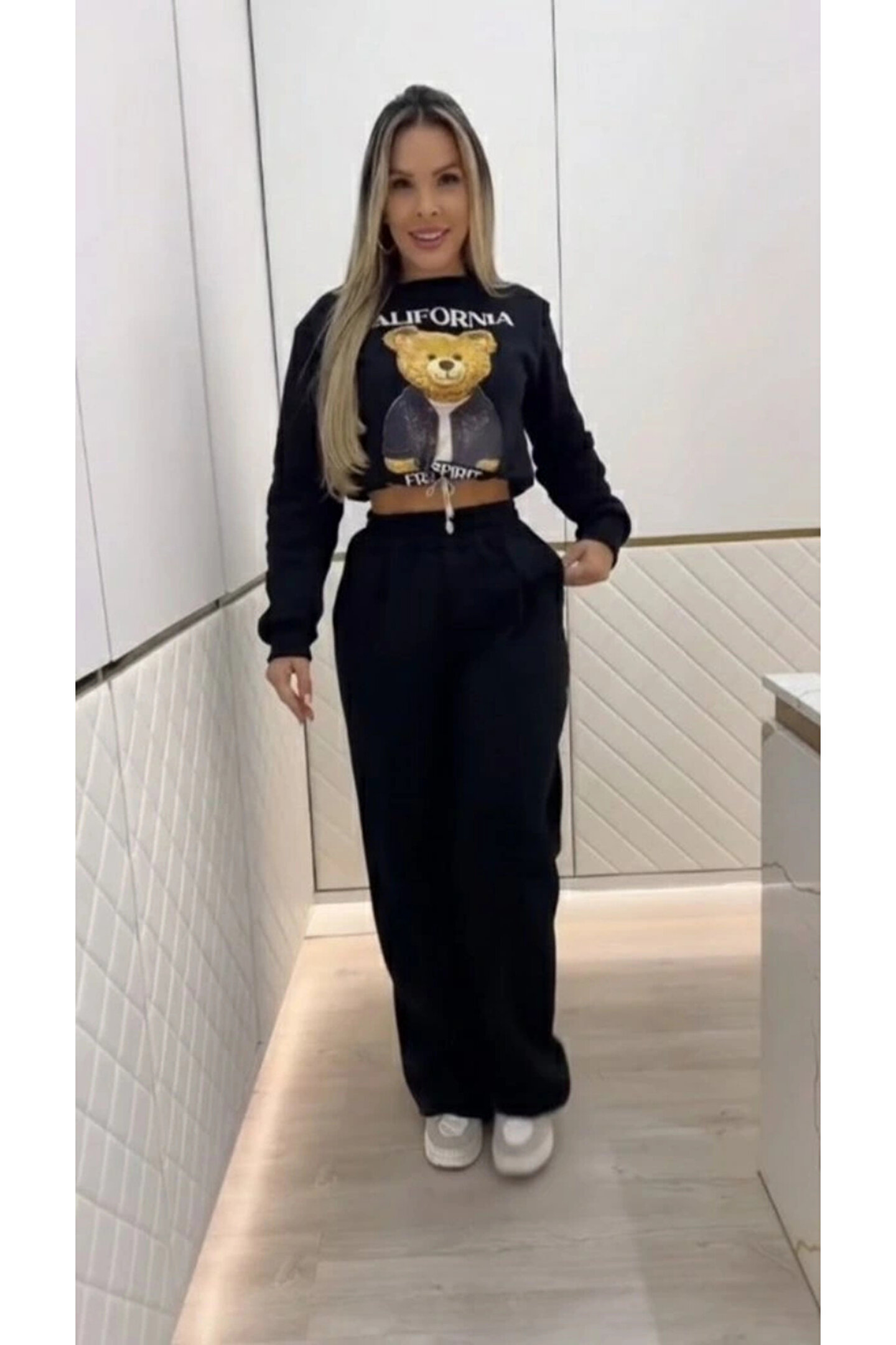 Kadın Uzun Kollu Bisiklet Yaka Desenli Iki Iplik şardonlu Bluz Ve Pantolon Ikili Takım