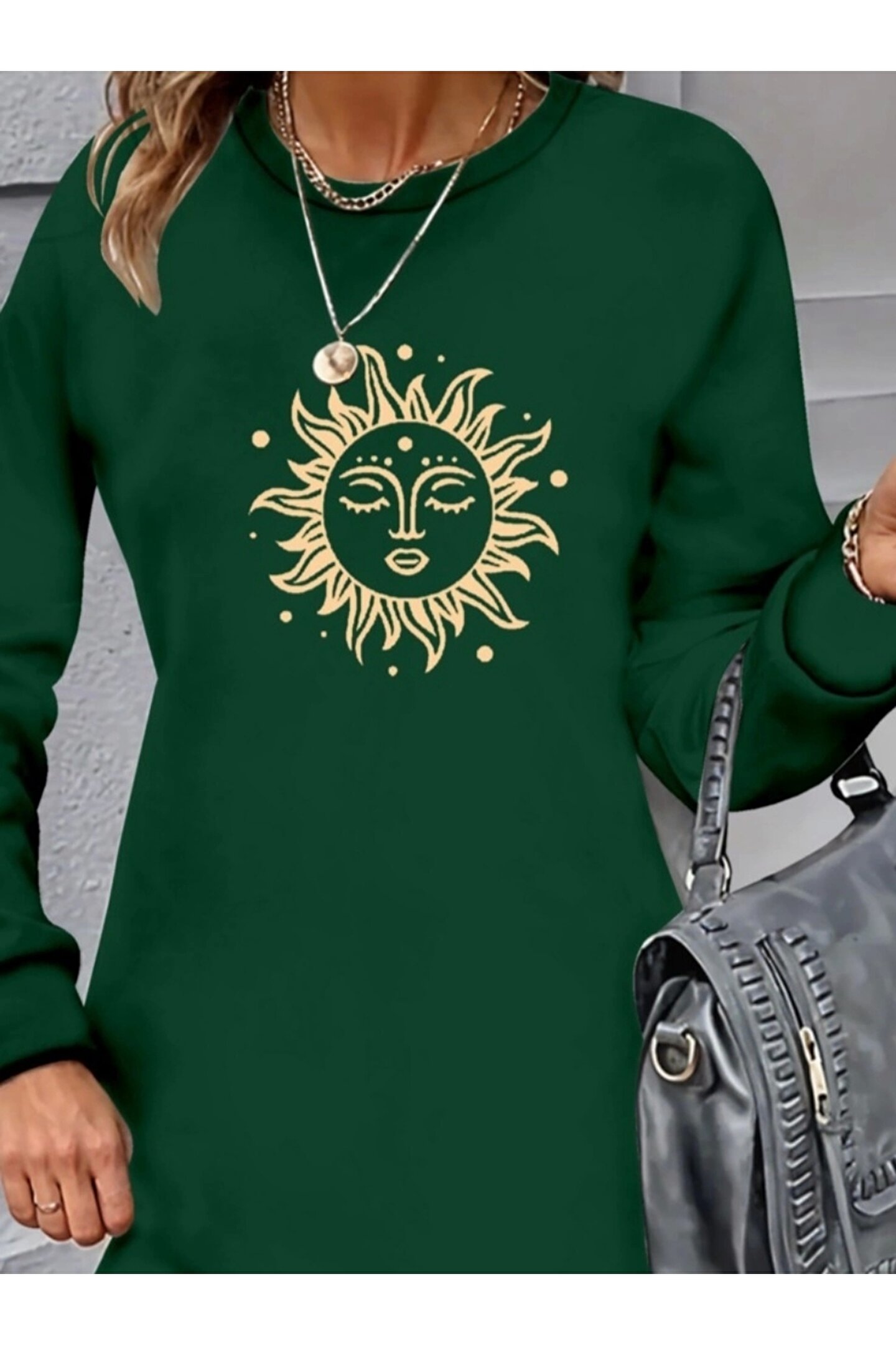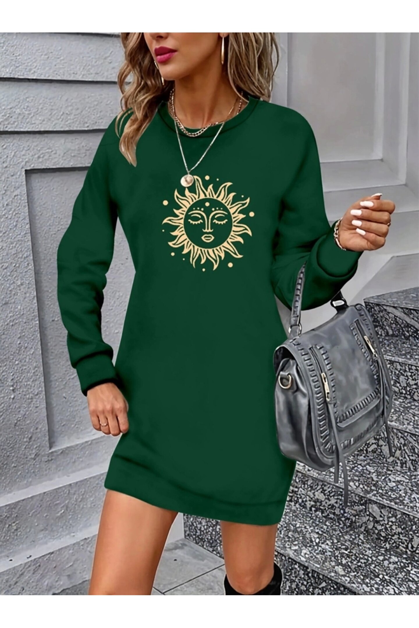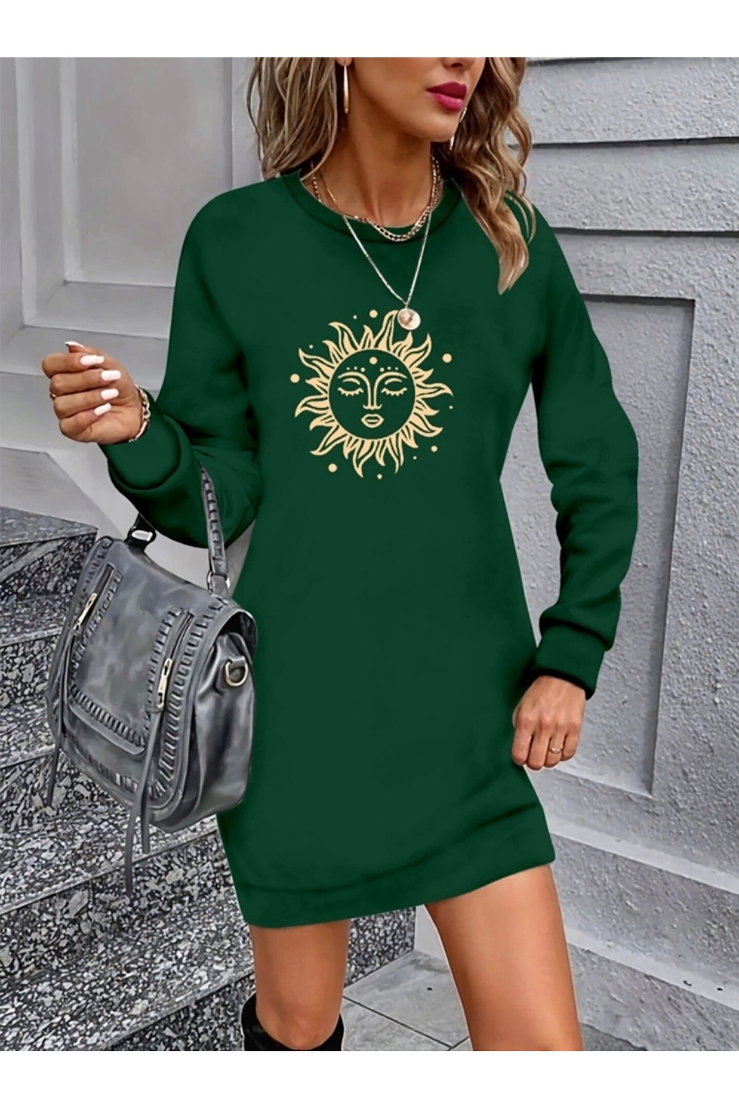 Kadın Uzun Kollu Bisiklet Yaka Güneş Desenli Viskon Iki Iplik Elbise