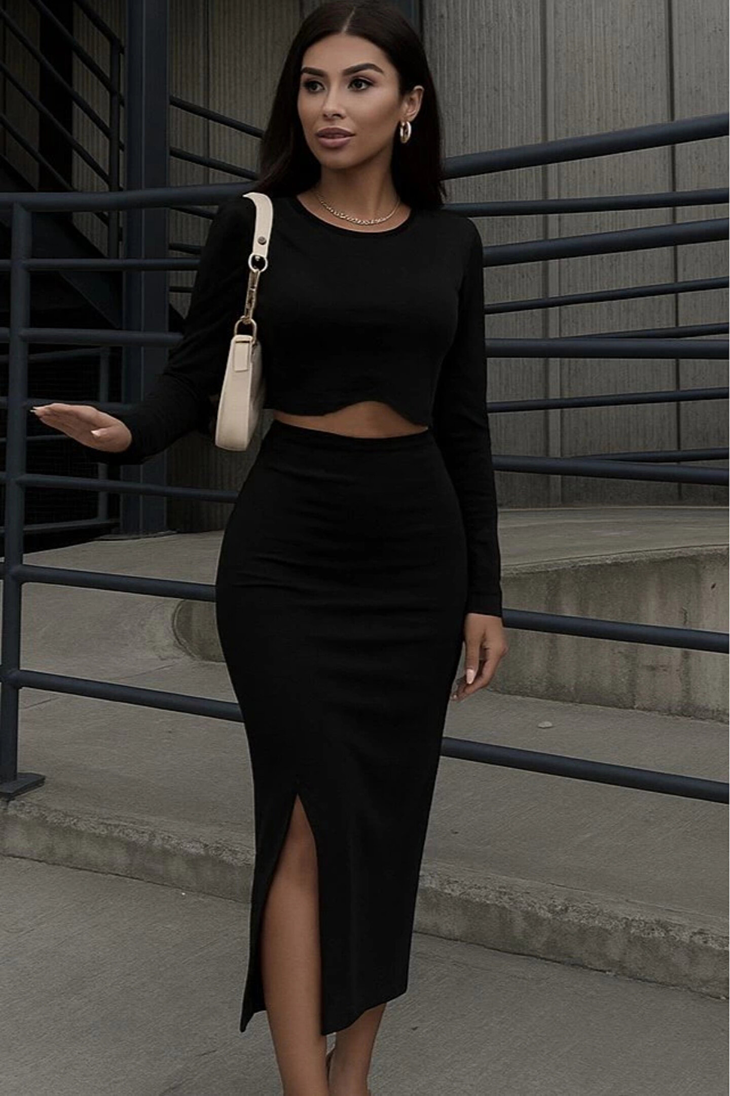 Kadın Uzun Kollu Bisiklet Yaka Kısa Krop Dalgıç Bluz Ile önden Yırtmaçlı Uzun Etek Ikili Takım
