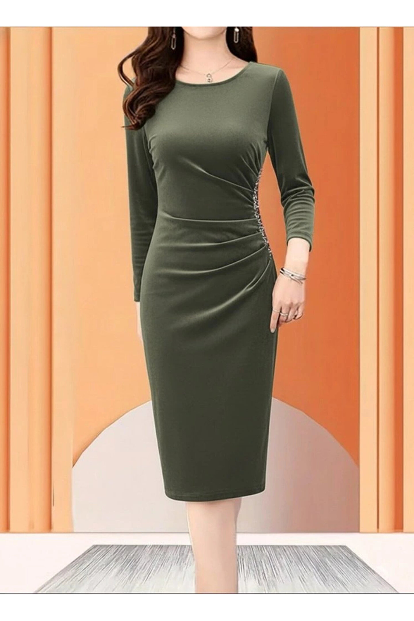 Kadın Uzun Kollu Bot Yaka Yanı Taş Detaylı Midi Kadife Elbise