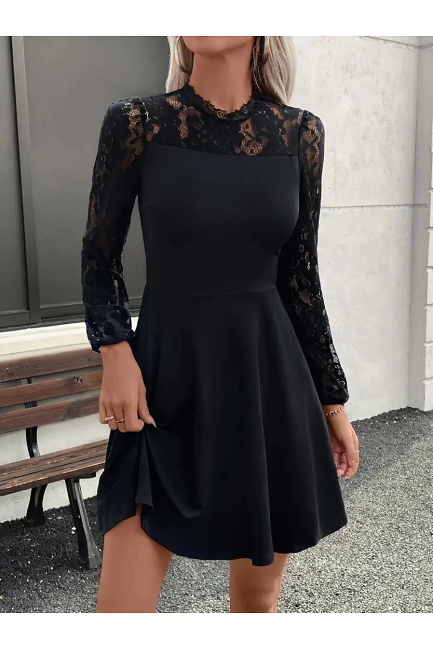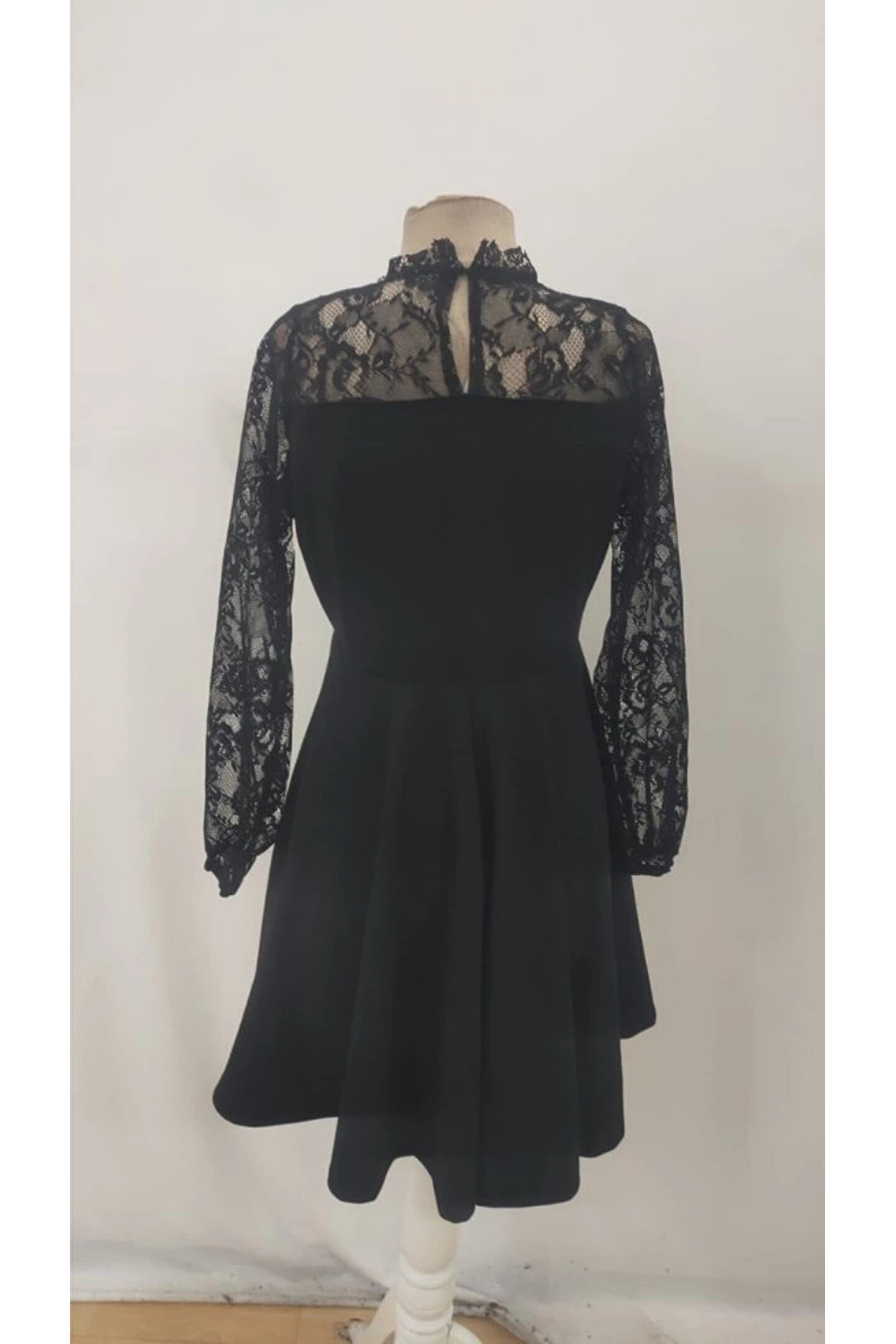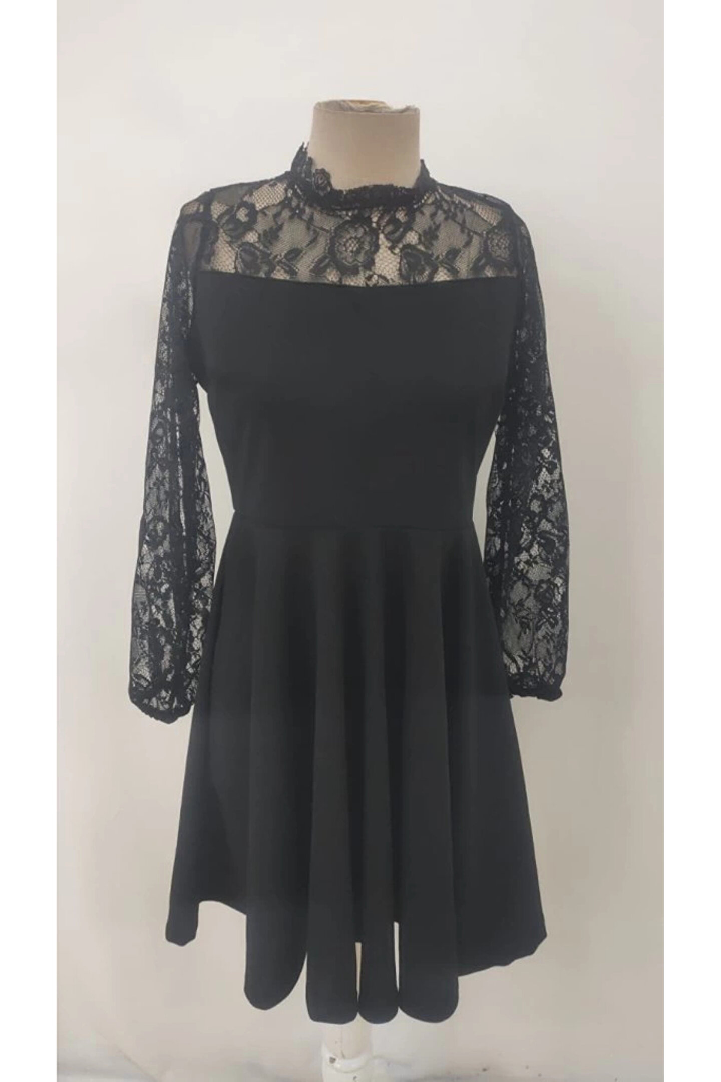 Pazarcan Kadın Uzun Kollu Dantelli Kloş Mini Ithal Krep Elbise