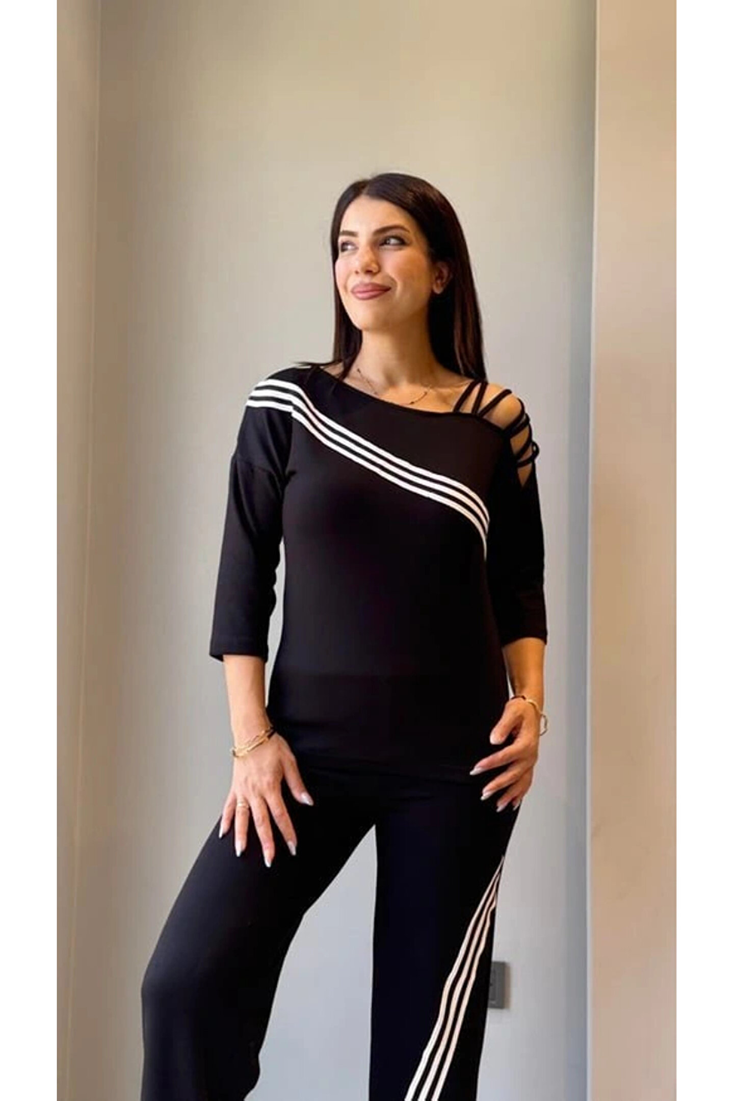 Kadın Uzun Kollu Truvakar Kol Tek Omuz çapraz şerit Detaylı Ribanalı Viskon Iki Iplik Bluz Ve Pantolon Ikili Takım