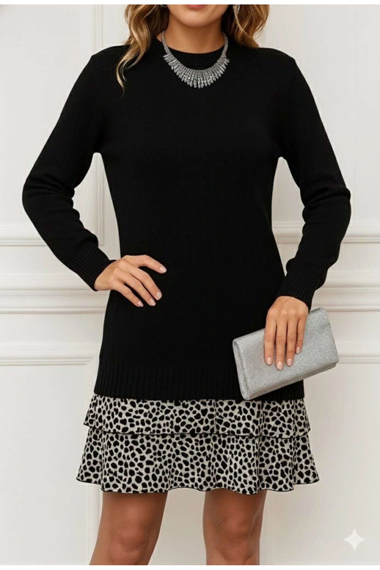 Kadın Uzun Kollu üst şardonlu Kaşkorse Alt Süprem Desenli Elbise