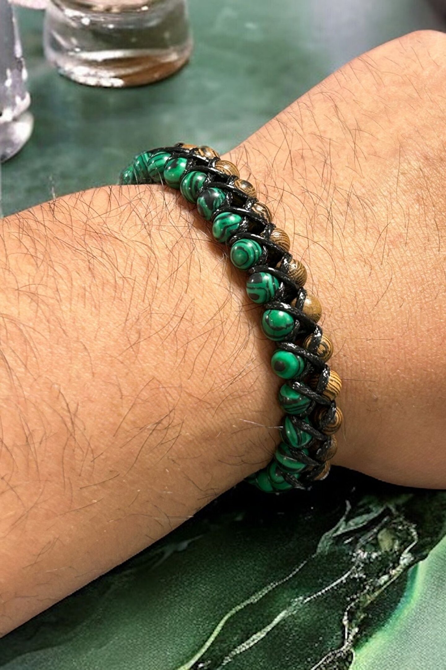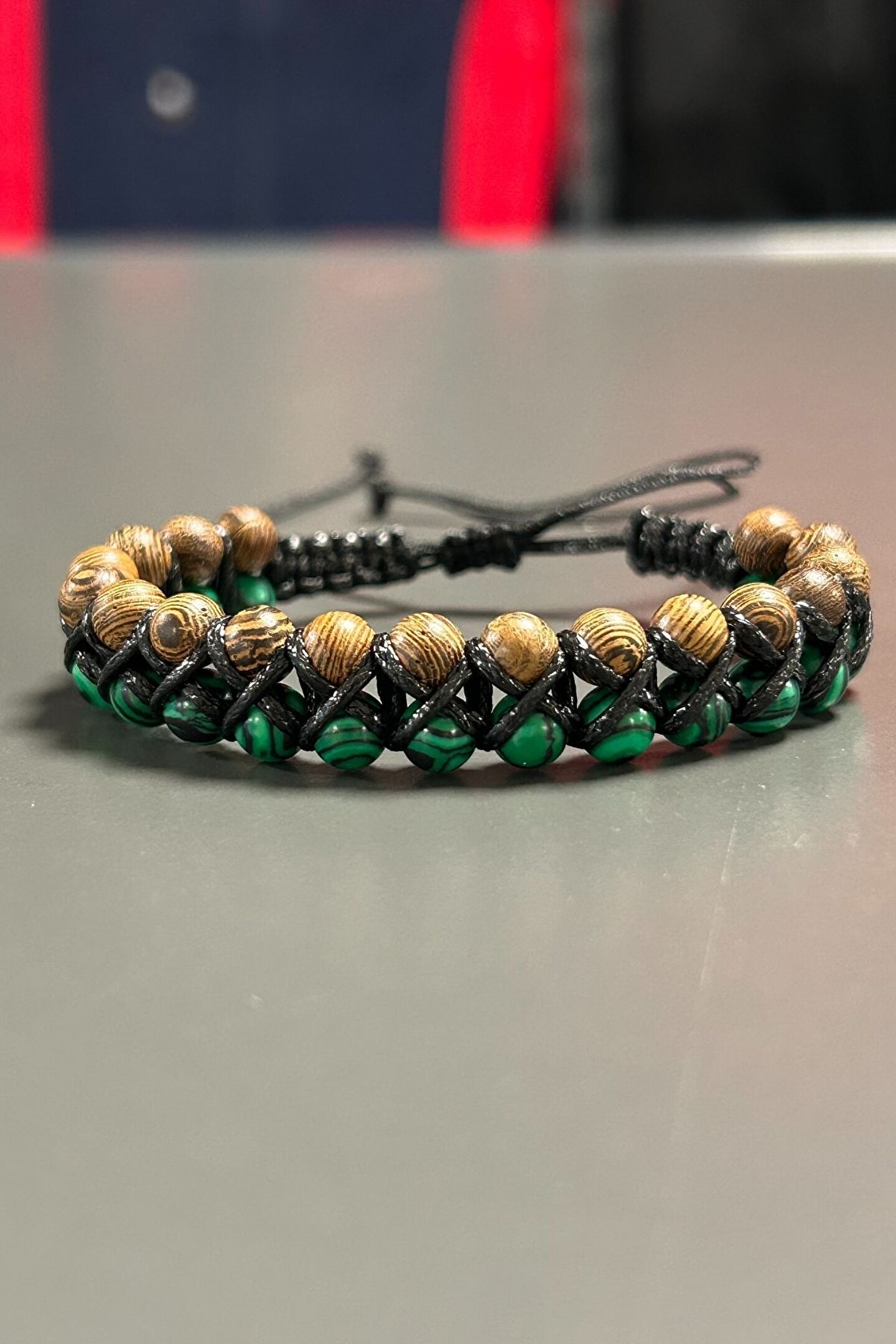 Aa kalite 6mm malahit taşı ve ud ağacı kullanılarak yapılmıştır. Tamamen el yapımıdır. Ayarlanabilir unisex bir bilekliktir. Her bileğe uygundur. 36 adet taş kulanılmaktadır. UD AĞACI: Öd ağacı uzun yıllardan beri varlığını sürdüren, ikiçenekliler sınıfına ait bir türdür. Ağaç Thymelaeaceae familyasına aittir. Meyveleri armut biçimindedir ve keskin bir kokusu vardır. Bu koku gövde ve dallarda çok daha yoğundur . Malahit taşı: Takı sektörü tarafından sıklıkla tercih edilen malakit taşının; sakinleştirici etkisi vardır ve negatif duyguları pozitife çevirmesiyle bilinir. Ayrıca vücudu rahatlatma, uykuya rahat dalma; suçluluk, korku, cesaretsizlik gibi duygulardan arınma, hafızayı güçlendirme, ağrıları kesme gibi özelliklere de sahiptir
