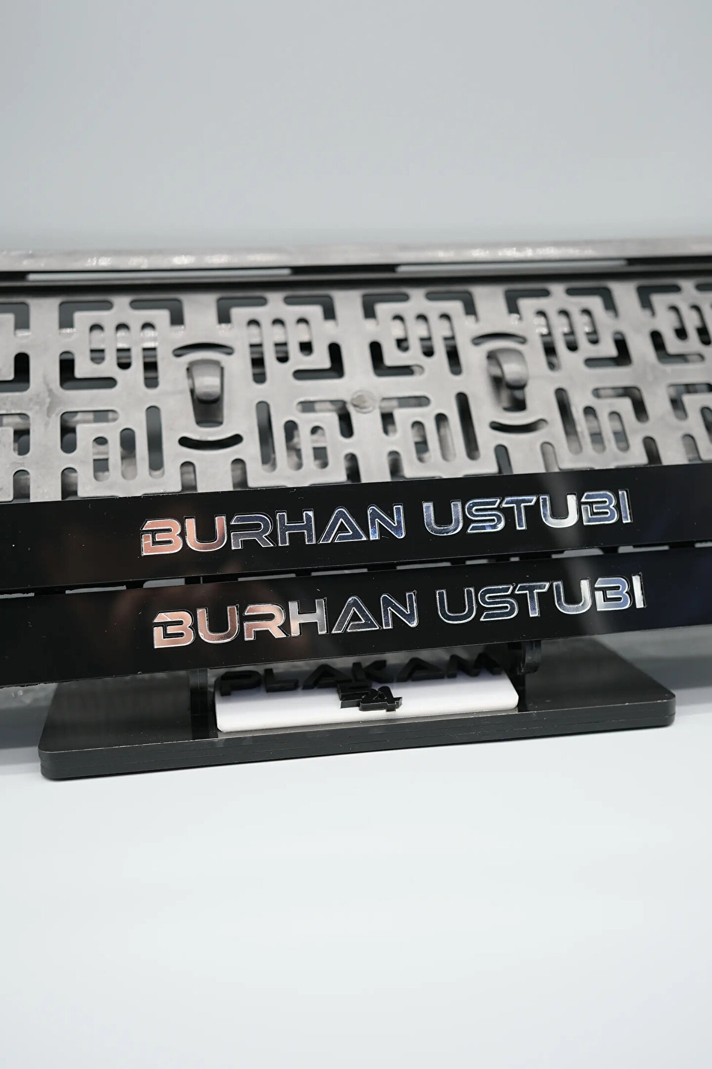 Sıradanı Sıradışıya Çevir! Lazer Kesim Plakalıklarımızla Tanışın!; Özellikler:; Alt çıta ve plakalık olmak üzere toplam 4 parçadan oluşur.; 3D kabartmalı veya gümüş tasarımı ile dikkat çeker.; UV baskı değil, silinme veya dökülme yapmaz.; Standart araba plakası ölçülerindedir (11x52 cm plakalar için uygundur).; Kalite ve Şıklığı Bir Arada Sunuyoruz:; Ürünlerimiz, parlak 1. sınıf kalitede pleksiyi lazer kesim kullanılarak özel yapıştırıcılarla birleştirilerek üretilir.; Sadece plaka değil, aracınıza özgü bir tarz katmanın en havalı yolu!; Dayanıklılıkta Sınır Tanımıyoruz:; Uzun süreli kullanıma uygun olan plakalıklarımız, özel yapıştırıcı teknolojisi ile birleşerek aracınızın stilini korur.; Silinme veya dökülme gibi sorunlarla karşılaşmadan uzun ömürlü bir deneyim sunar.; 3D Kabartmalı Tasarım:; Plakalıklarımızın eşsiz 3D kabartma tasarımı, sizi diğer araçlardan farklı kılacak.; Görsel şölenimiz aracınıza estetik bir dokunuş katıyor.; Kolay Montaj, Büyük Etki:; Aracınıza özel tasarımı hemen kullanmaya başlamak için ürünlerimizin montajı oldukça basittir.; Size zahmetsiz bir kişiselleştirme deneyimi sunuyoruz.;Gerçek Görseller, Gerçek Ürün:; ürün görsellerimizle alacağınız ürün arasında çita malzeme fark yok.; Ürün özellikleri ile ilgili olan sorularınızı ürünün altında yer alan Satıcı Soruları bölümünü tıklayarak sorabilirsiniz.;Siparişiniz ile ilgili sorularınızı veya taleplerinizi Sipariş Detay'da yer alan Soru Sor bölümünden iletebilirsiniz.;Siparişi oluşturduktan sonra Örnek sipariş:"Sipariş numaram: 1111111111, Plakalık Üstüne Yazılacak yazı: ADINIZ SOYADINIZ Üstübi"şeklinde bizlere sipariş bilgilerinizi iletebilirsiniz.;Sipariş sonrası ürün soru sor kısmına üründeki seçmiş olduğunuz plakalığa yazılacak yazıyı belirtiniz.;Yazınızı belirtmediğiniz taktirde görselde yer alan modele siparişteki isim yazılarak gönderilecektir.; Farklı modeller için diğer ürünlerimizi inceleyebilirsiniz.;Ürünlerimiz takım olup 2 adet gönderilecektir.;Plaka çerçevesine yazmak istediğiniz en fazla 30 karakter giriniz; NOT Büyük Küçük harf Font uyumuna bağlıdır Küçük Harfler ile yazlı olan bilgileriniz font uyumlu ise küçük harflerde kullanılır.;Güvenle satın alın ve aracınızı şık ve özgün kılın.; Aracınızı Kişiselleştirin, Stilinizi Yansıtın!;