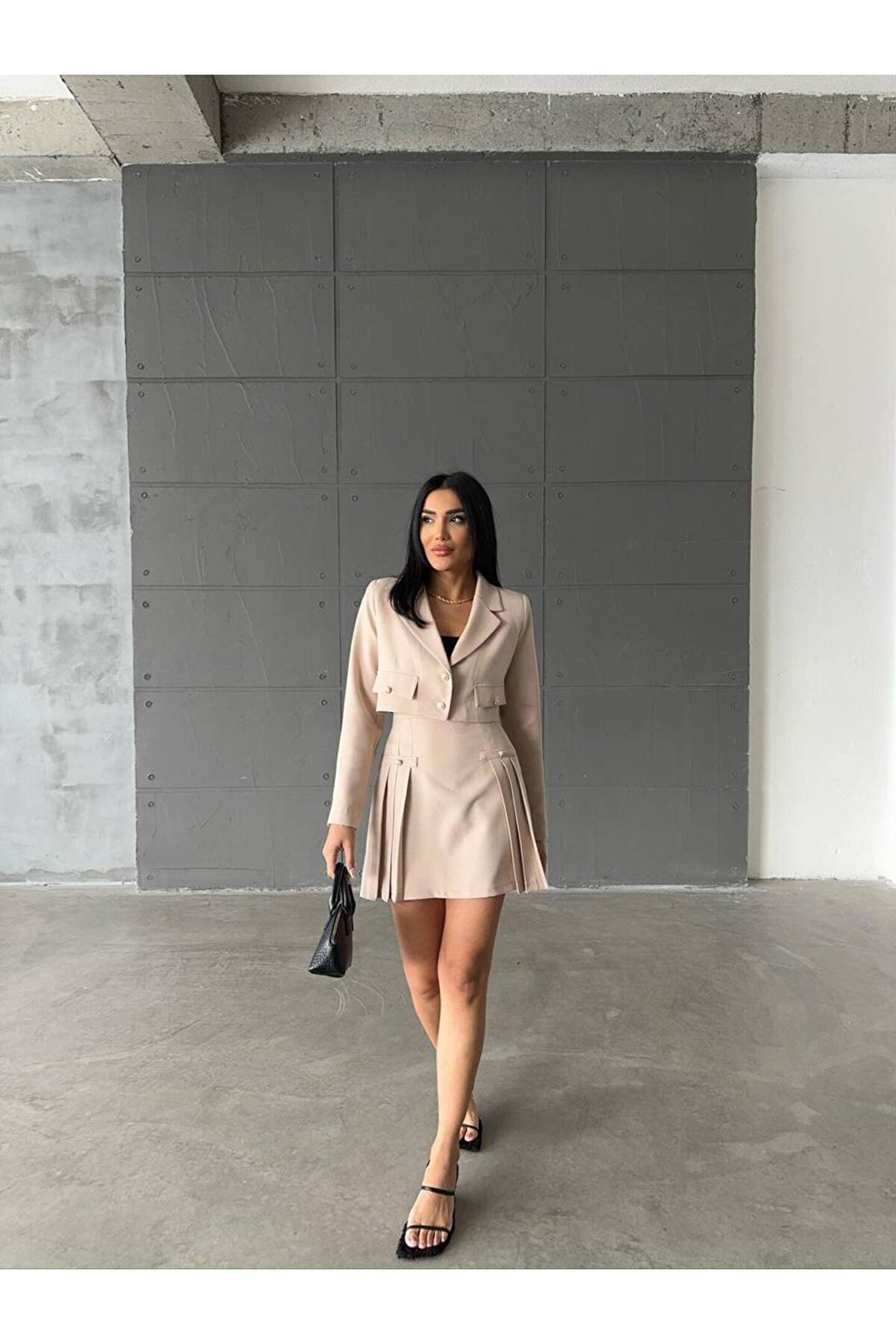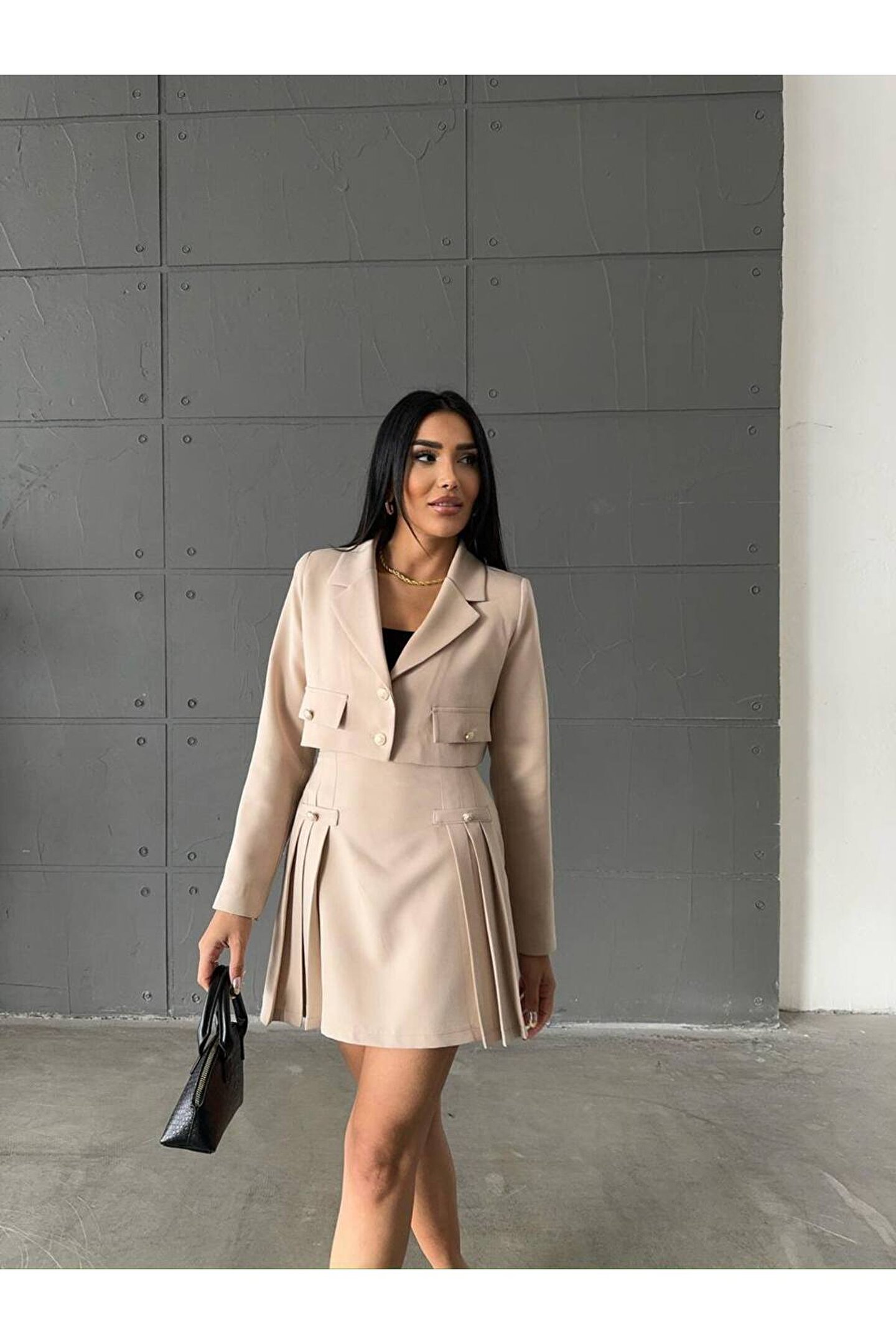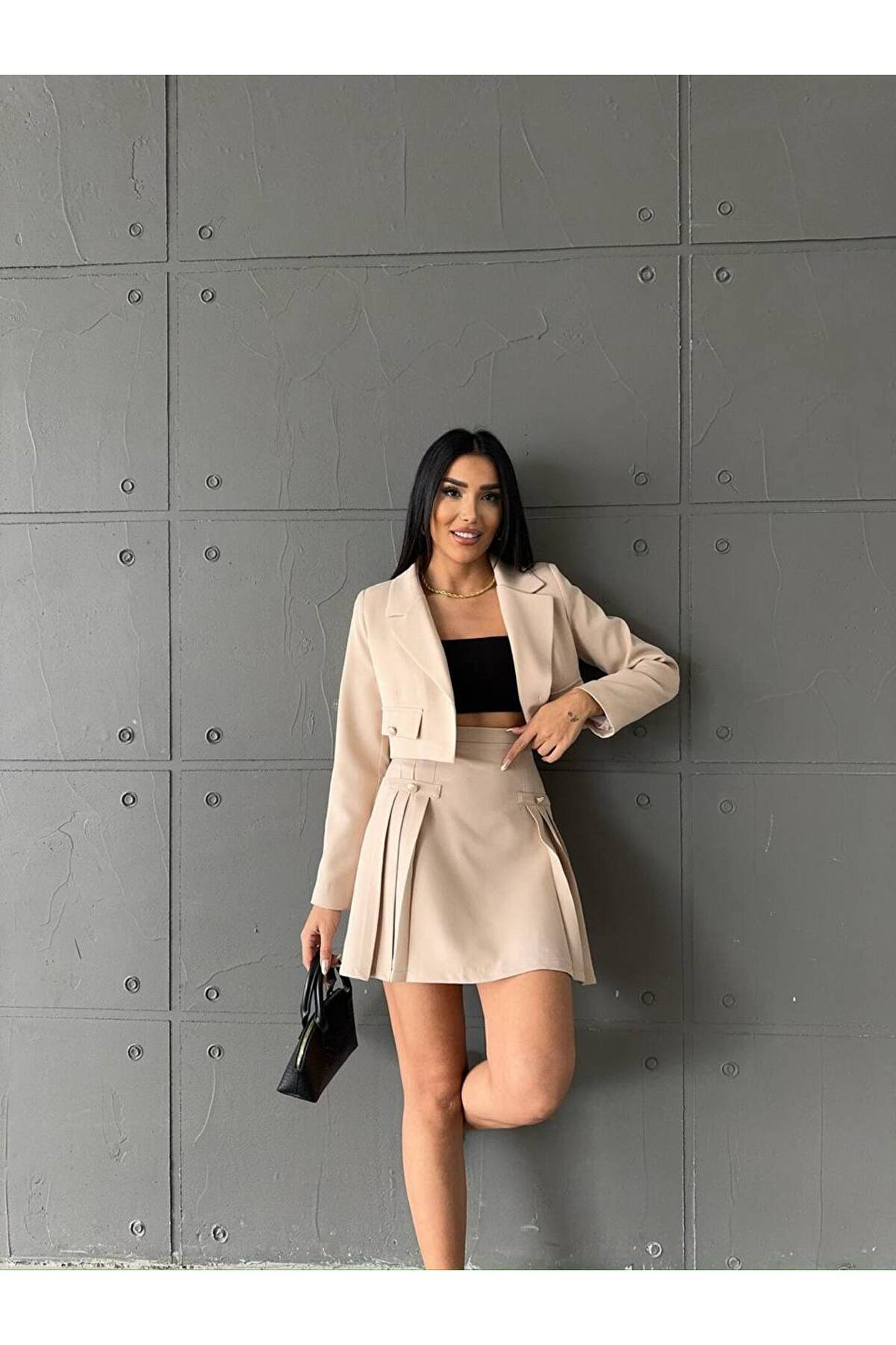 Modern ve şık tasarımıyla dikkat çeken Atlas kumaştan üretilmiş crop ceket, pileli etekle tamamlanan bu takım, genç ve dinamik tarzınızı yansıtmanız için idealdir.; Slim kalıp sayesinde vücut hatlarınıza mükemmel uyum sağlayarak feminen siluetinizi ön plana çıkarır.; Crop ceketin kısa boy tasarımı, modern ve trend bir görünüm kazandırırken, pileli eteğin hareketliliğiyle kombinlerinizde canlı bir etki yaratır.; Dokuma kumaşı sayesinde dayanıklı ve kaliteli malzeme kullanımı, uzun süreli kullanım için idealdir.; Her yaş grubuna hitap eden geniş yaş aralığına sahip olan bu takım, gençlerin enerjik ruhunu yansıtırken aynı zamanda tüm yaş gruplarına da uyum sağlayarak geniş bir kullanıcı kitlesi sunar.;