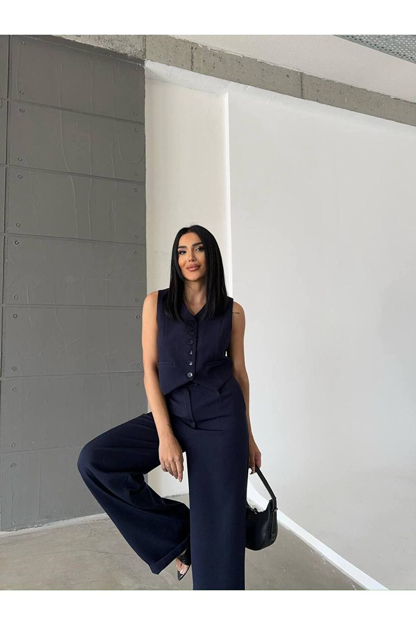 popibutik Atlas Kumaş Yüksel Bel İspanyol Paça Pantolon Yelek siyah Takım